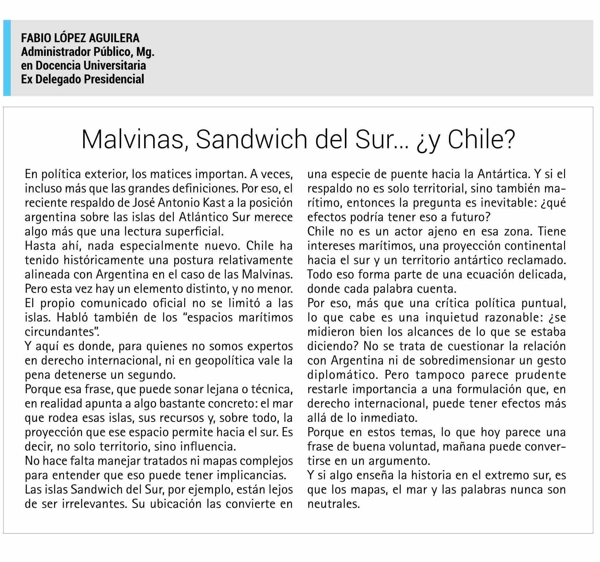 Título: COLUMNAS DE OPINIÓN: Malvinas, Sandwich del Sur... ¿y Chile?