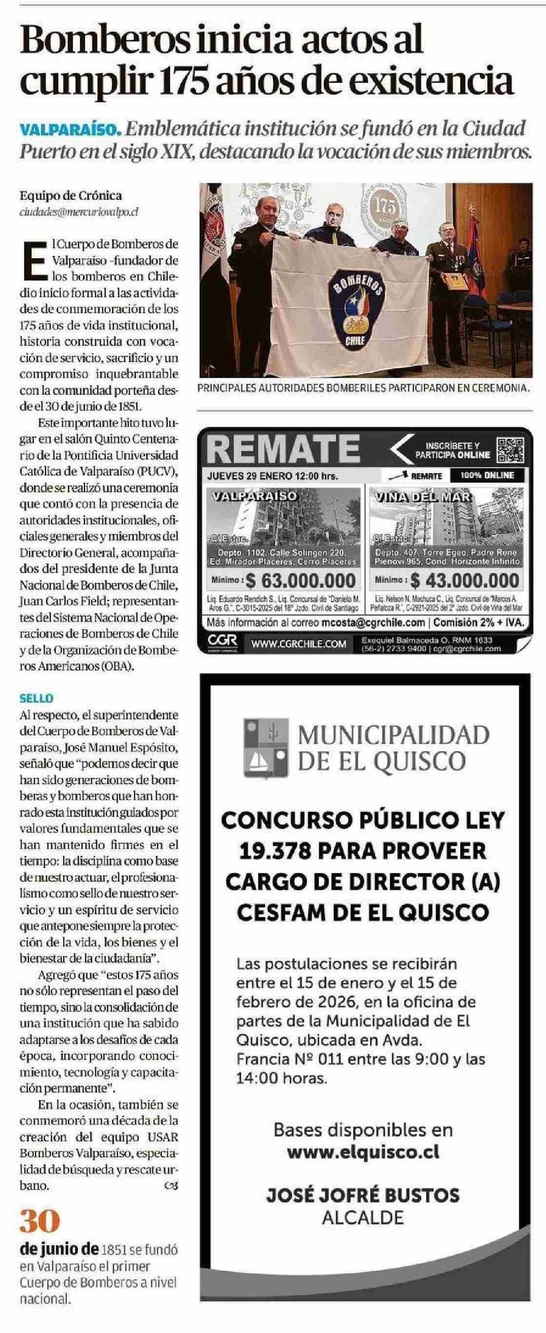 Bomberos inicia actos al cumplir 175 años de existencia 18-01-2026 El Mercurio de Valparaíso |
