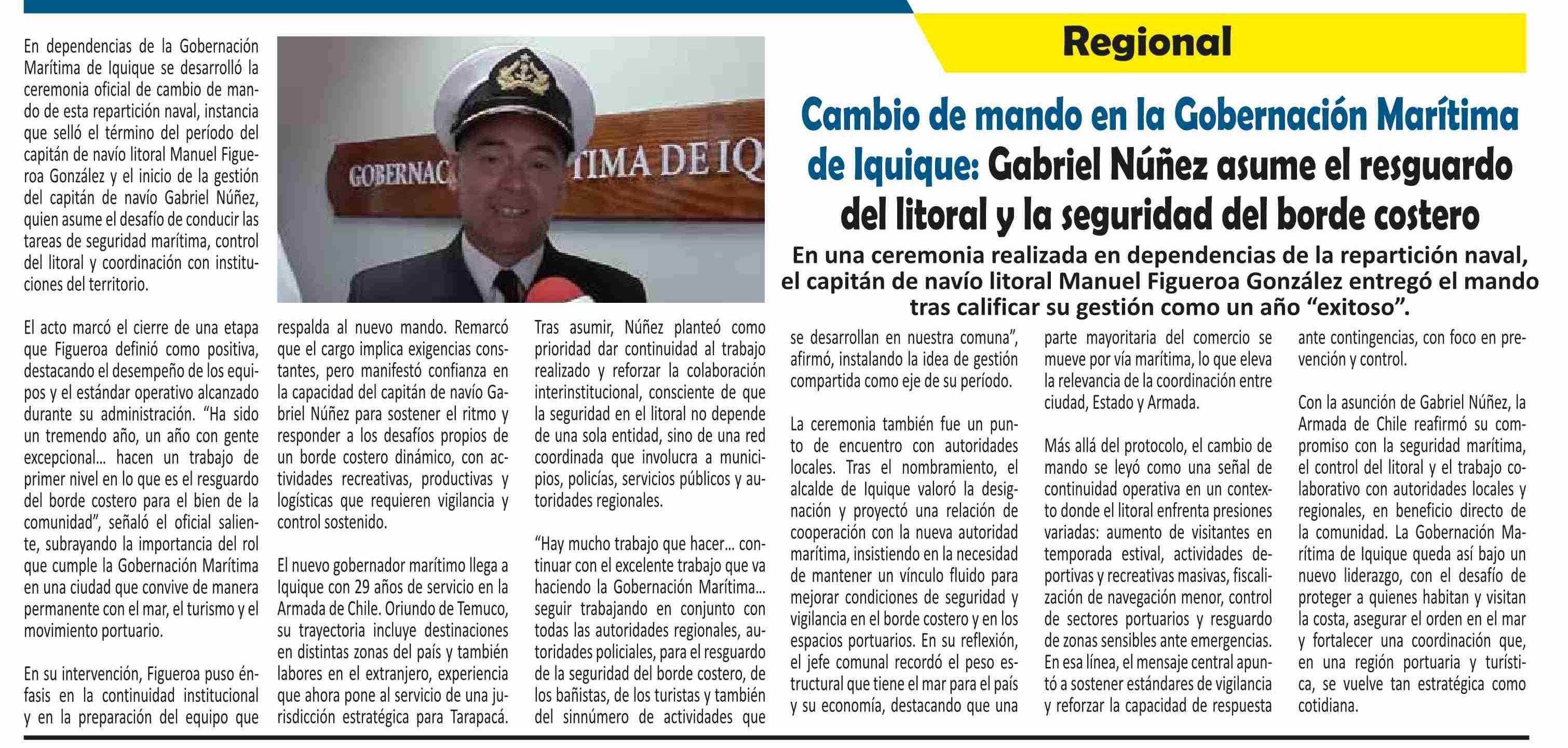 | Título: | Cambio de mando en la Gobernación Marítima de Iquique: Gabriel Núñez asume el resguardo del litoral y la seguridad del borde costero |