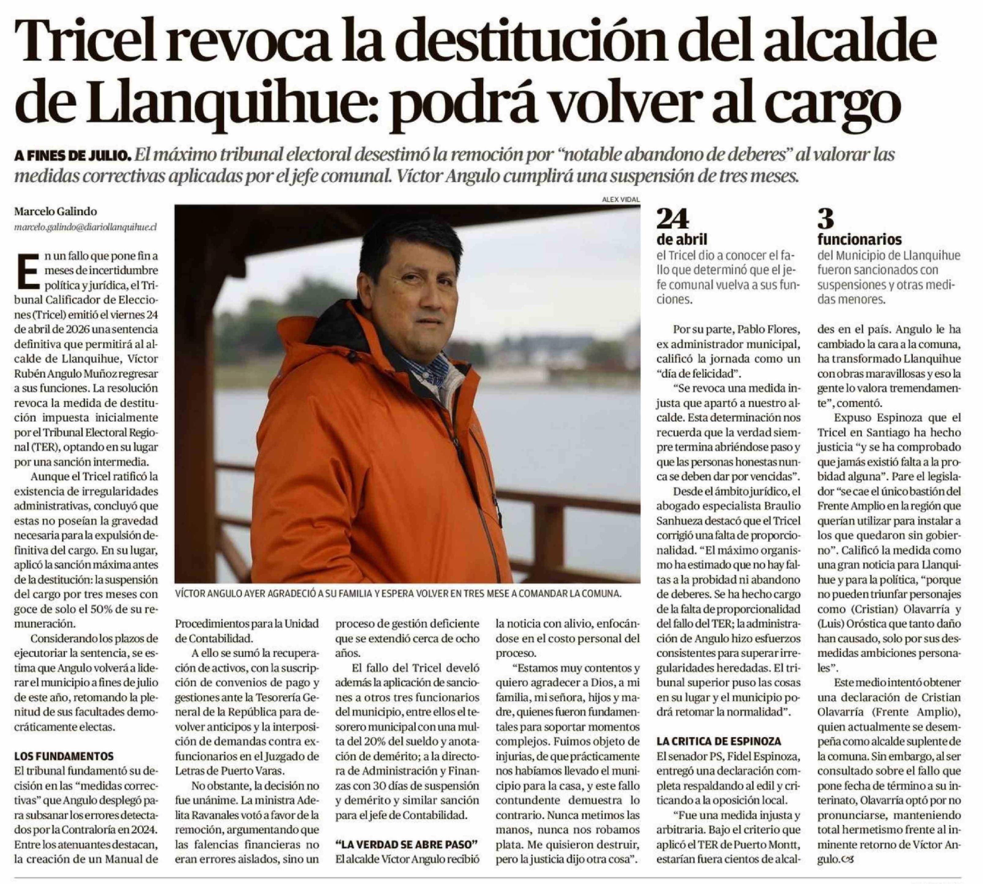 Tricel revoca la destitución del alcalde de Llanquihue: podrá volver al cargo 26-04-2026 El Llanquihue |