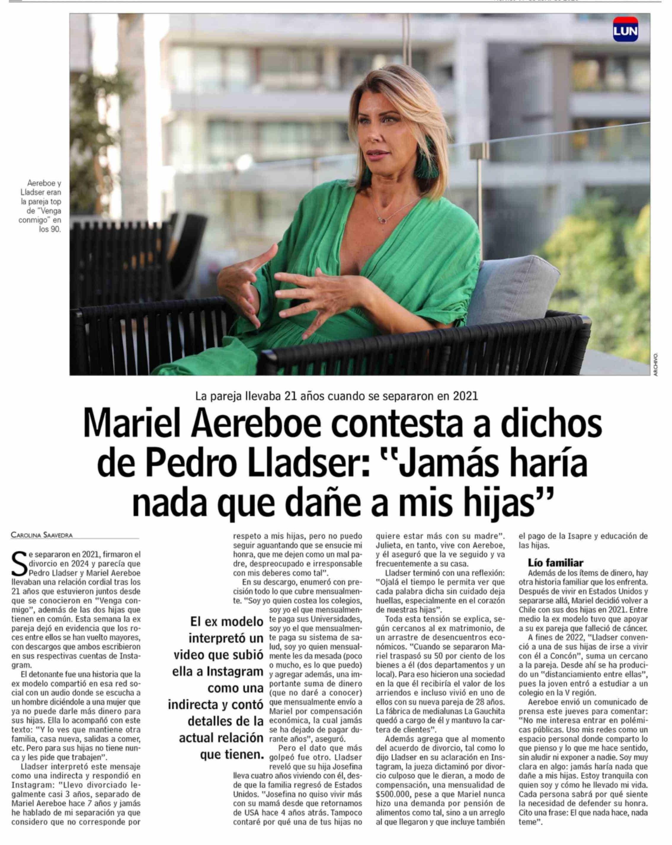 | Título: | Mariel Aereboe contesta a dichos de Pedro Lladser: "Jamás haría nada que dañe a mis hijas" |