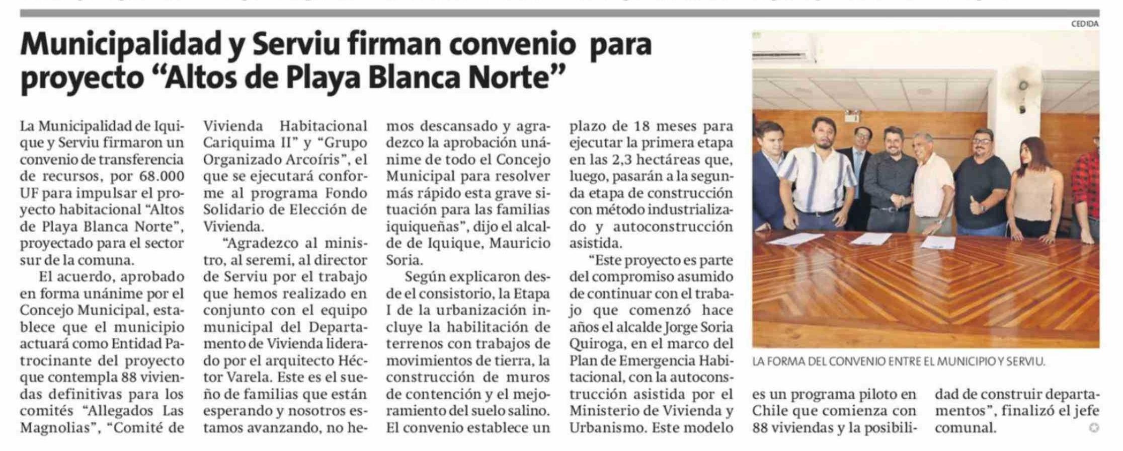 | Título: | Municipalidad y Serviu firman convenio para proyecto "Altos de Playa Blanca Norte" |