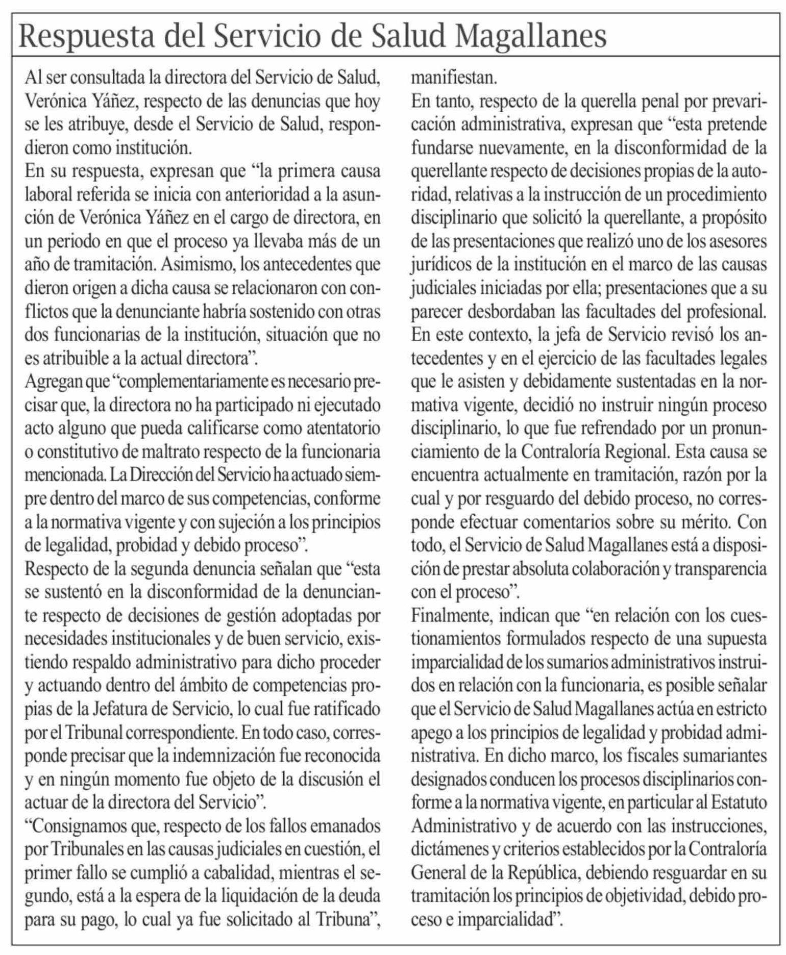 Respuesta del Servicio de Salud Magallanes