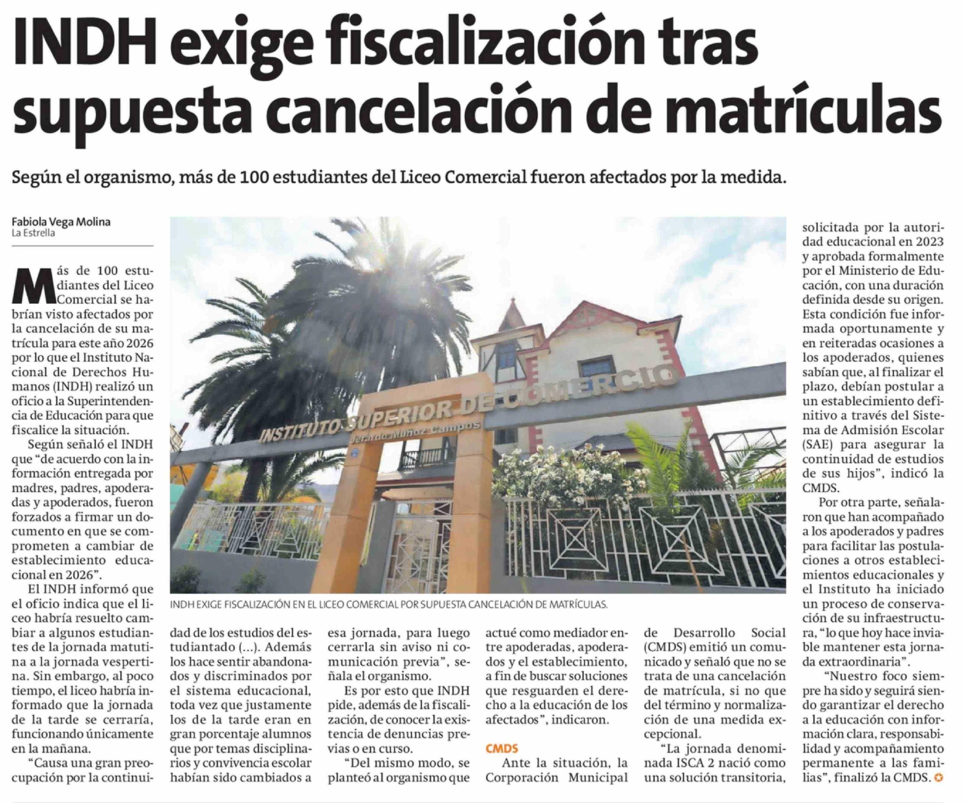 Título: INDH exige fiscalización tras supuesta cancelación de matrículas