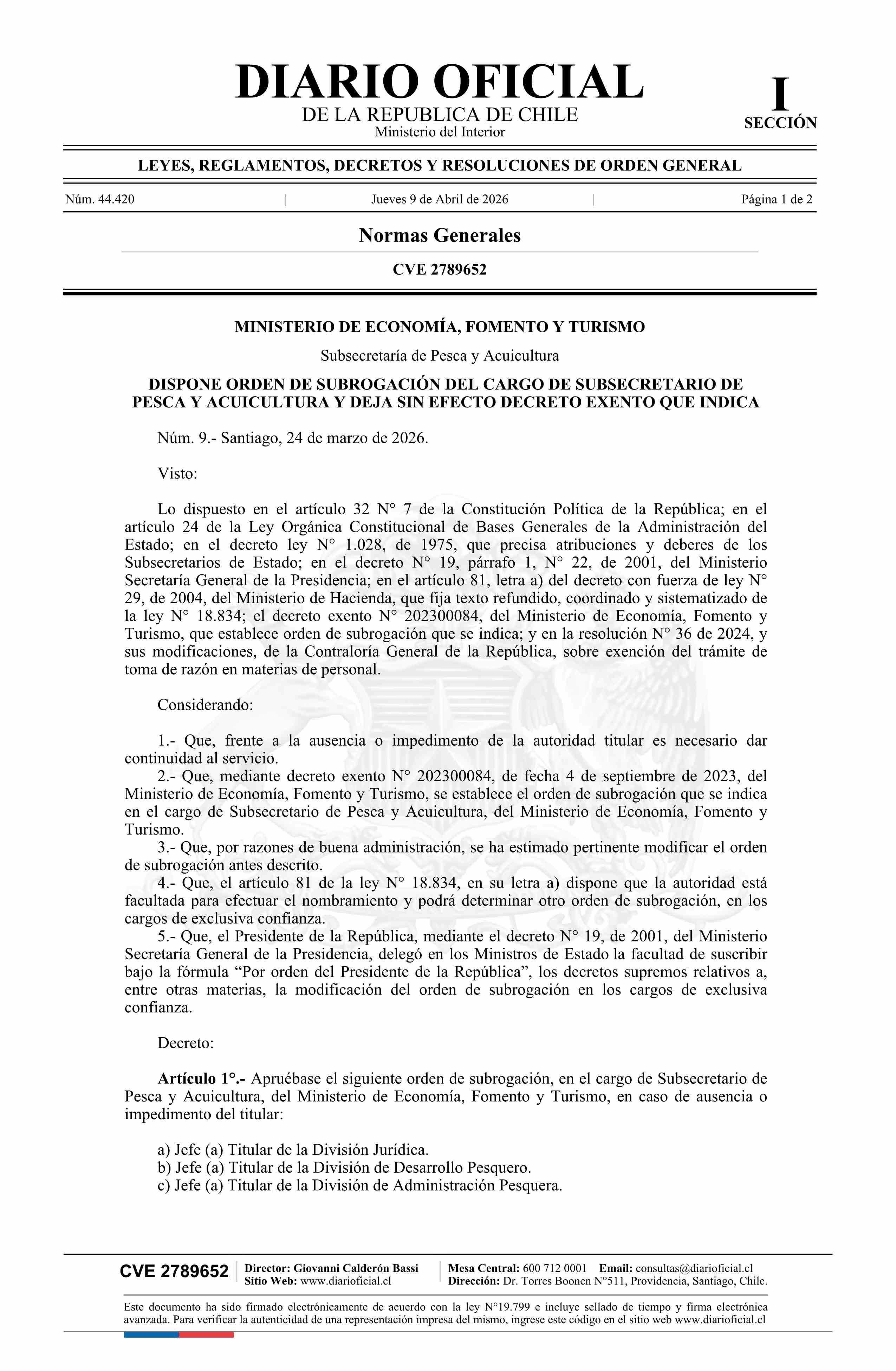 Decreto número 9, de 2026.- Dispone orden de subrogación del cargo de Subsecretario de Pesca y Acuicultura y deja sin efecto decreto N° 202300084 exento, de 2023 09-04-2026 Diario Oficial Edición Electrónica |