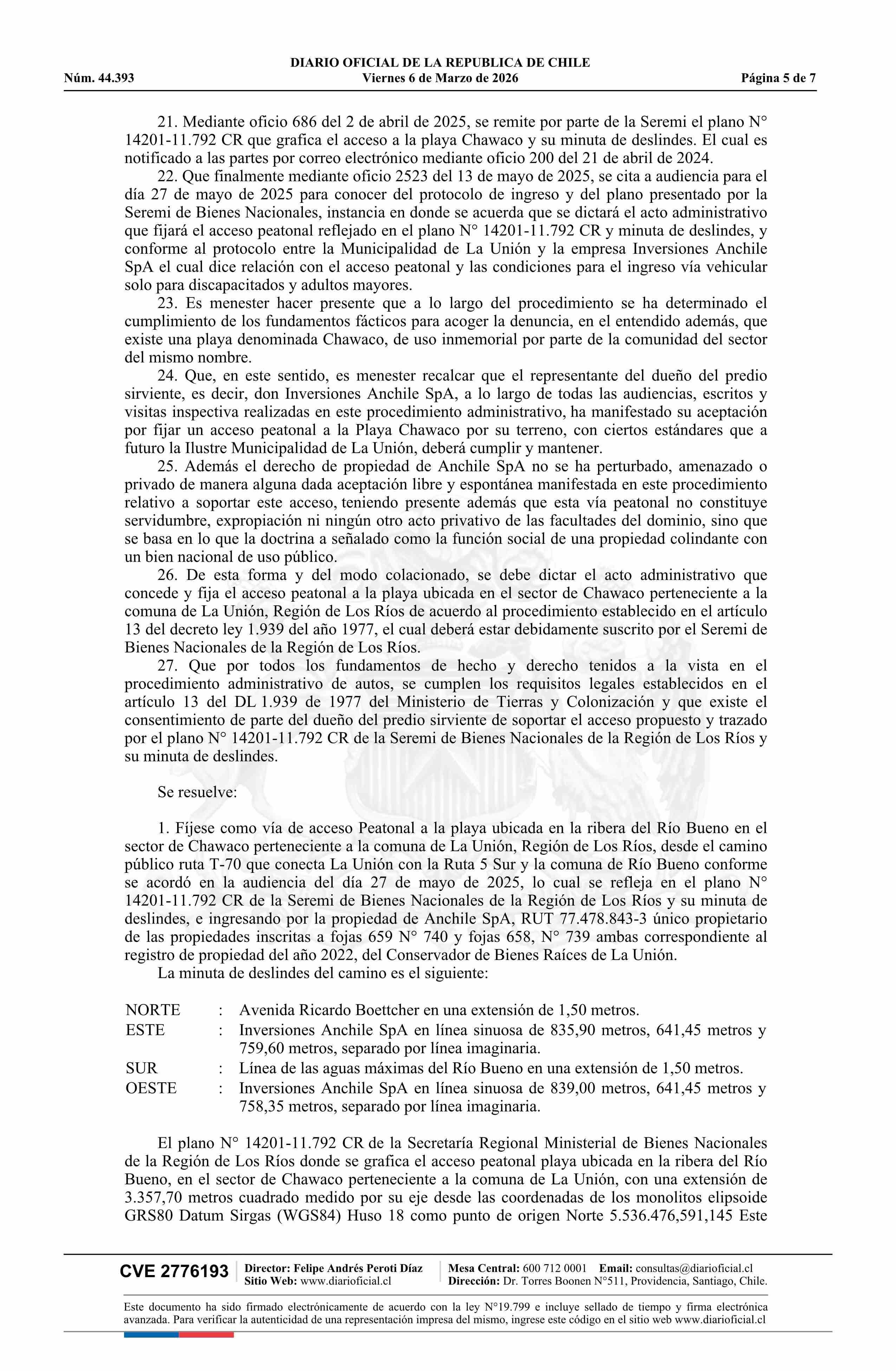 Resolución exenta número 554, de 2025.- Resuelve fijación de acceso peatonal a playa ribera Lago Ranco, sector Chawaco, en la comuna de La Unión