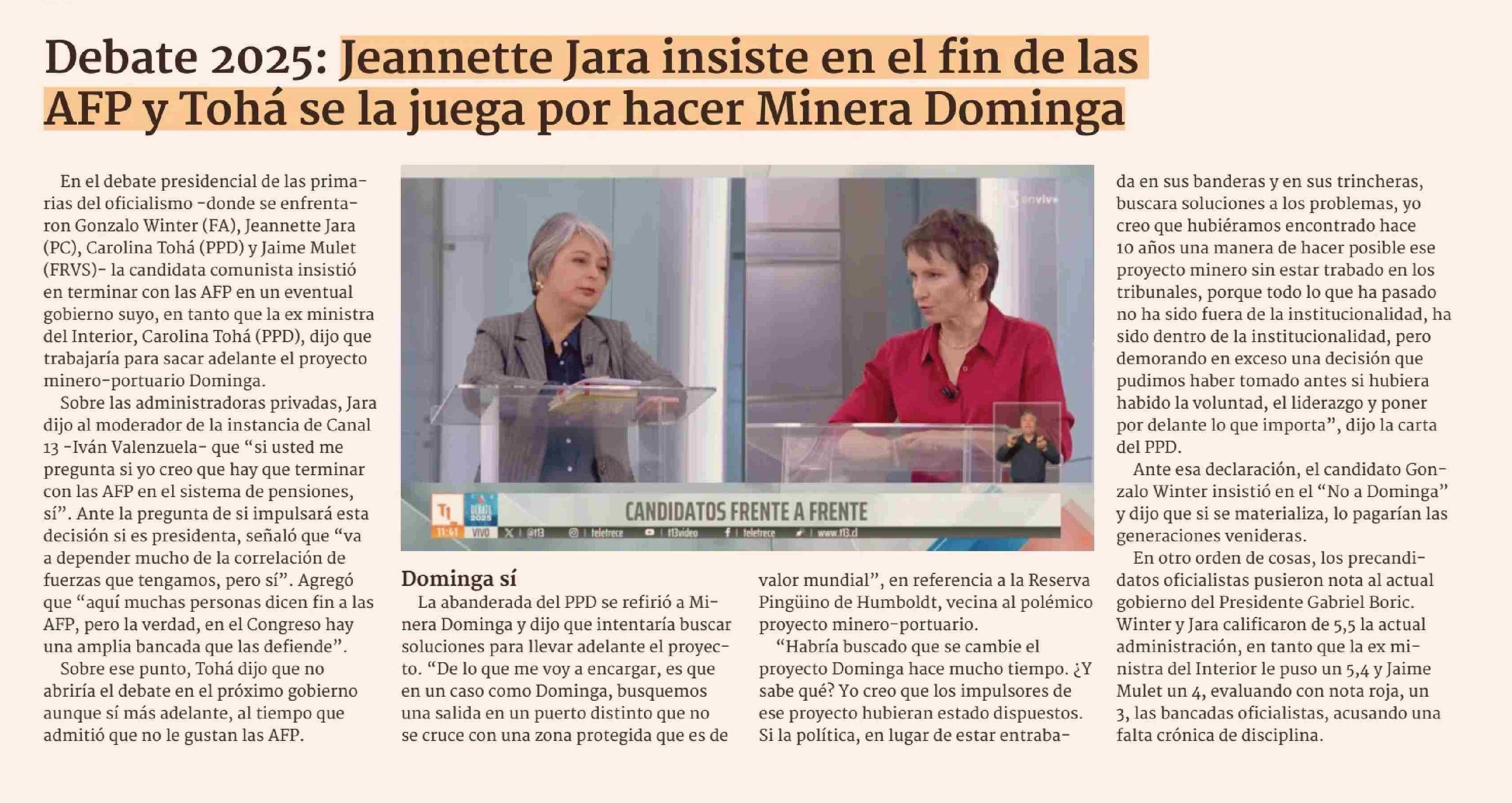 Debate 2025: Jeannette Jara insiste en el fin de las AFP y Tohá se la juega por hacer Minera Dominga 16-06-2025 Diario Financiero |