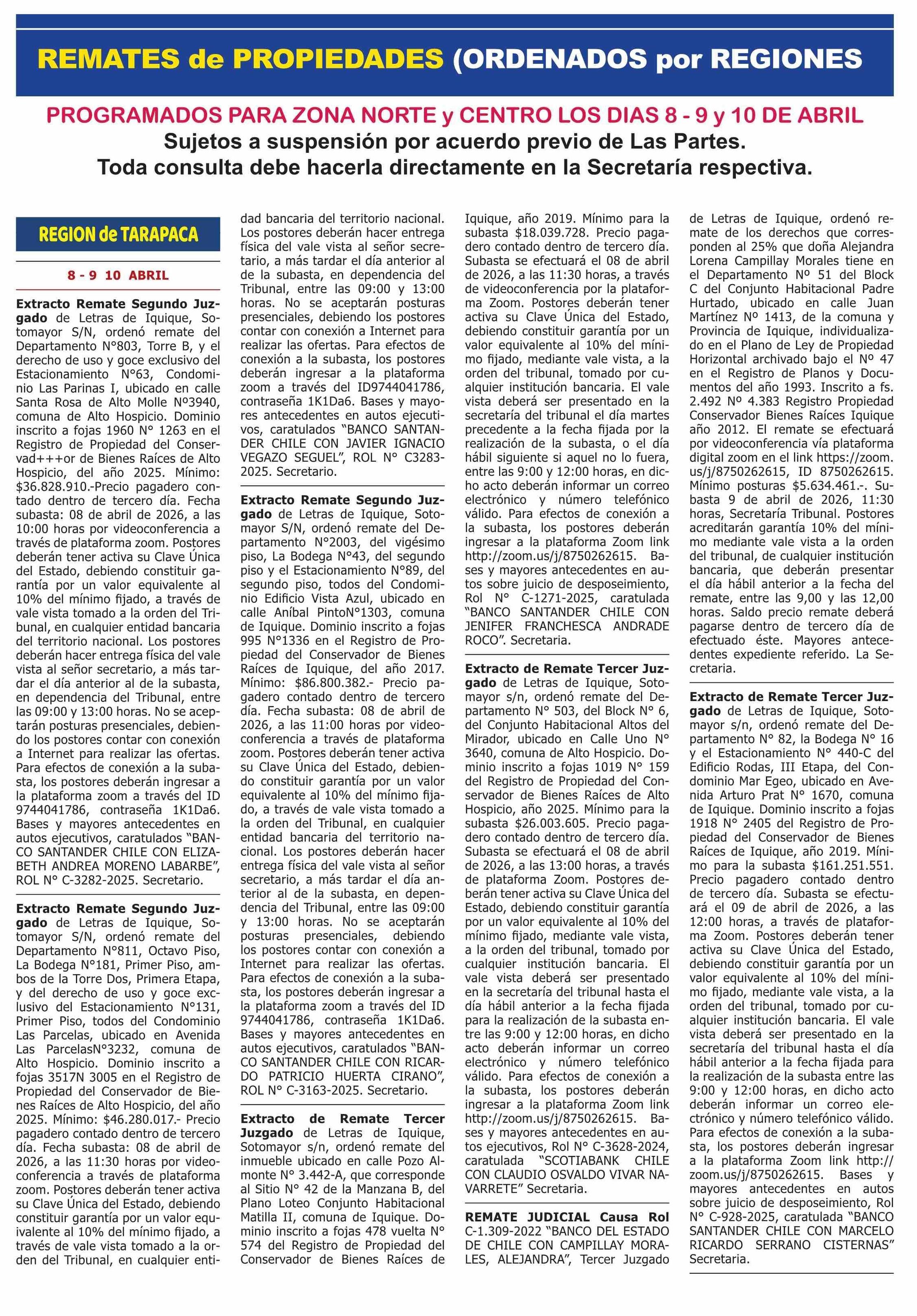 REMATES: REMATES de PROPIEDADES (ORDENADOS por REGIONES 31-03-2026 P&L Públicos y Legales |
