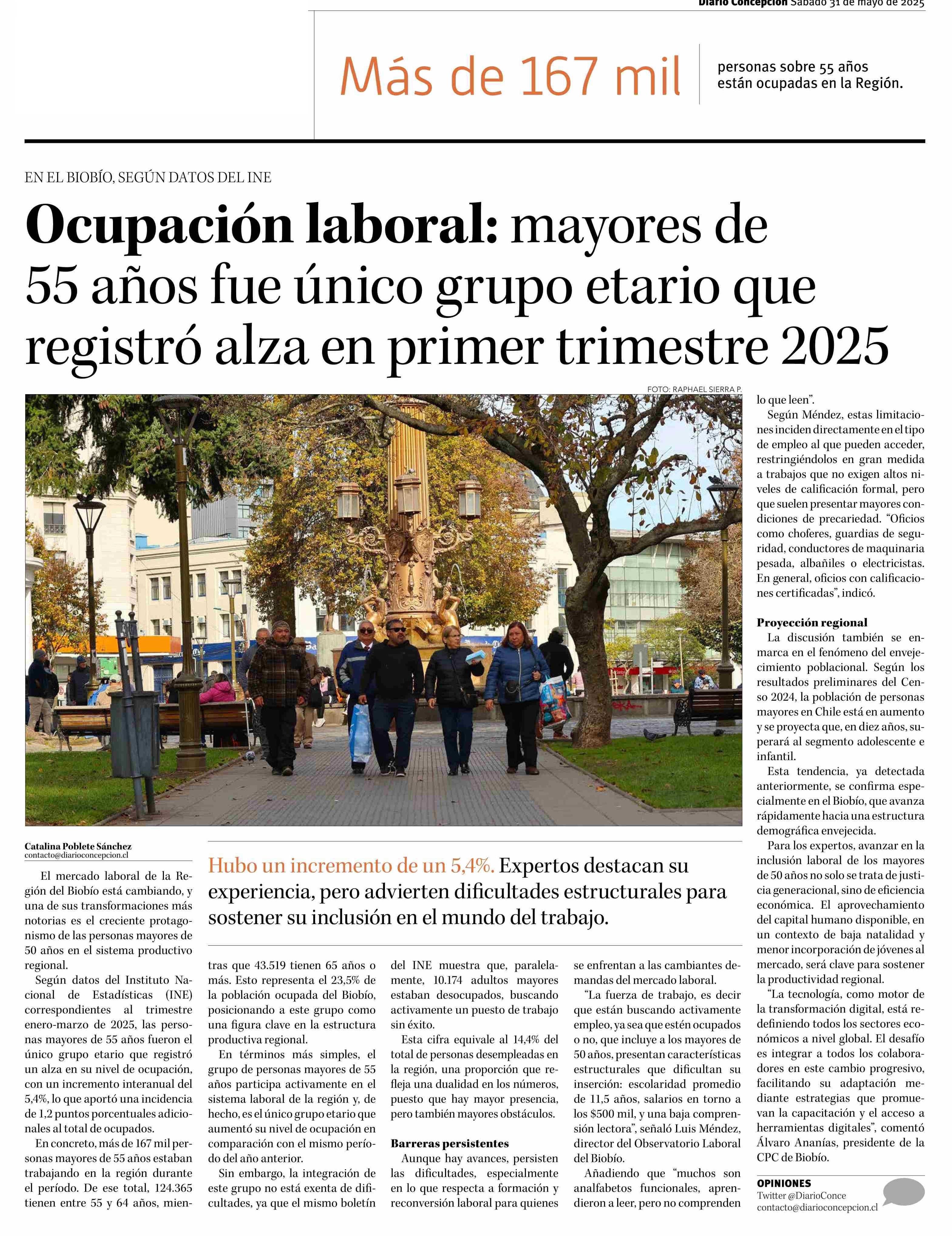 Ocupación laboral: mayores de 55 años fue único grupo etario que registró alza en primer trimestre 2025 31-05-2025 Diario Concepción |