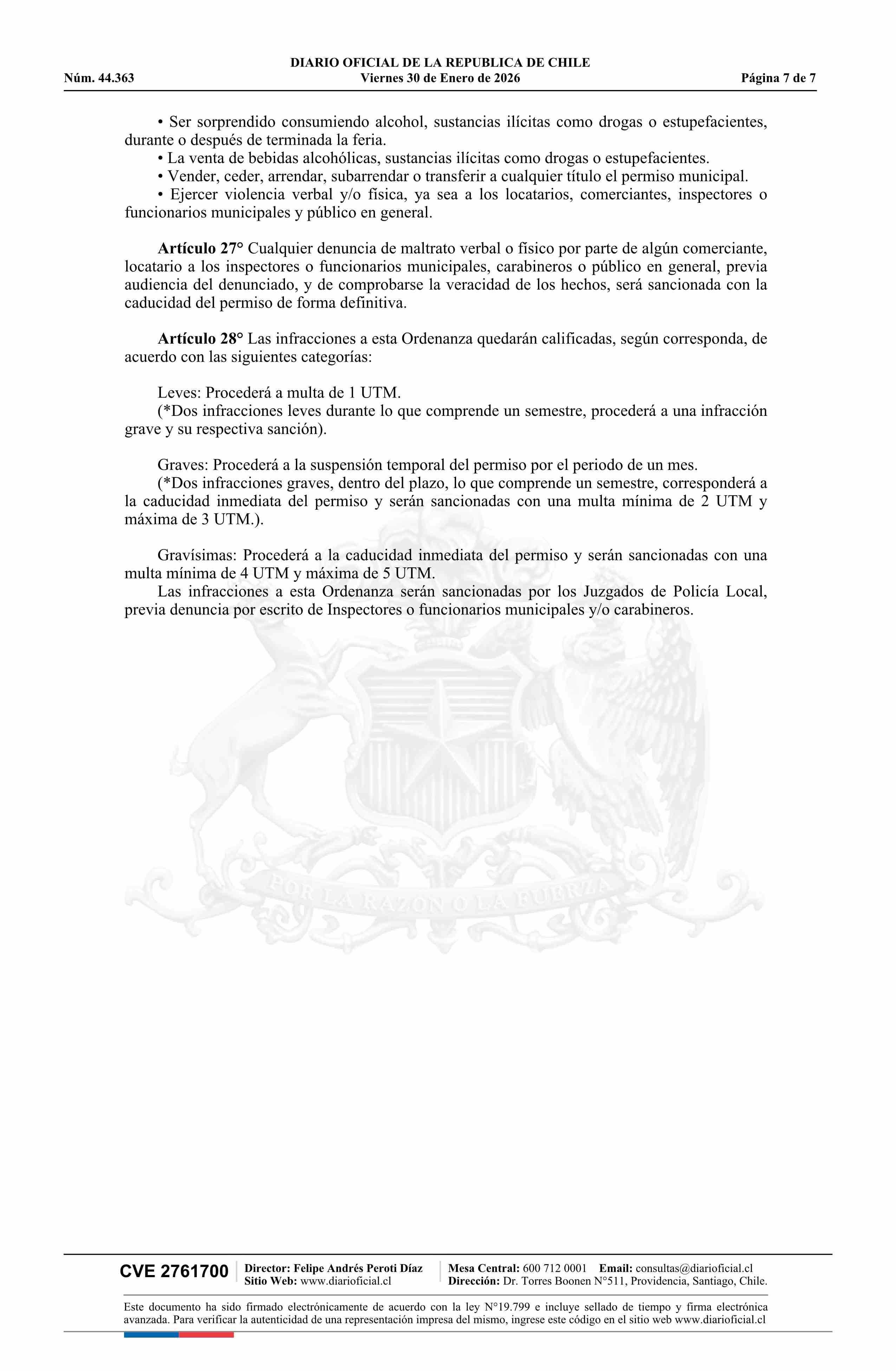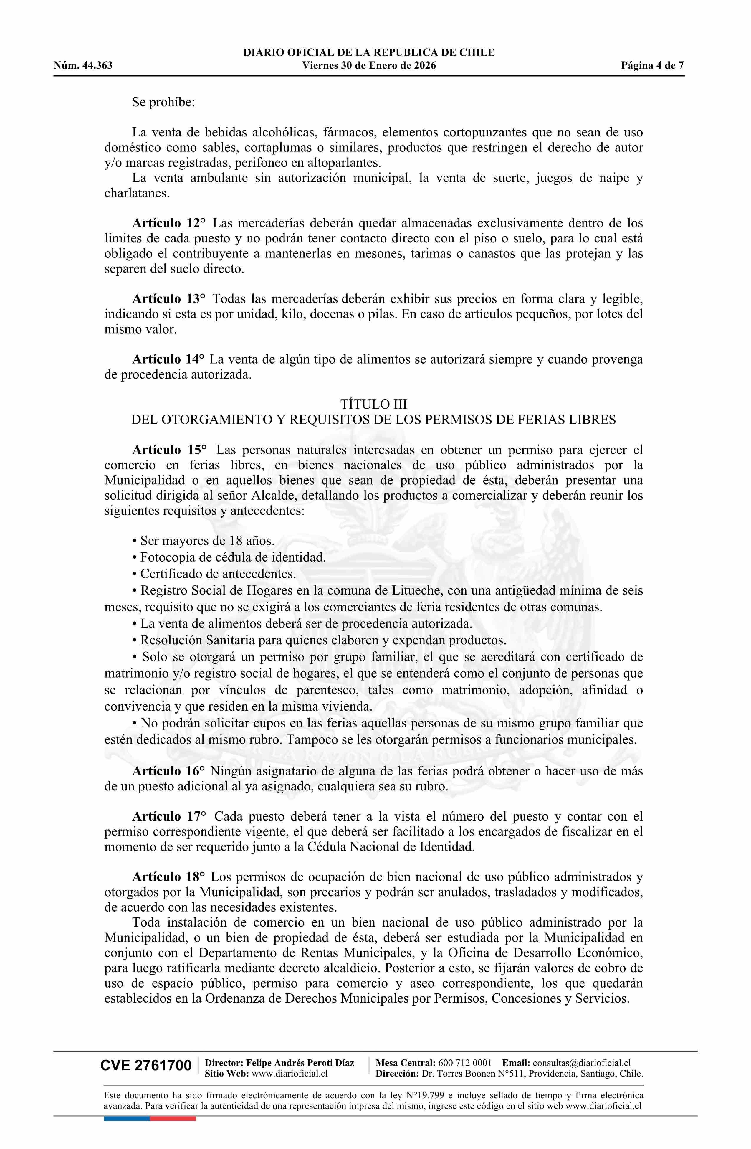 Decreto alcaldicio número 123, de 2026.- Aprueba Ordenanza de Ferias Libres, Comercio Ambulante y Uso de Espacios Públicos 30-01-2026 DIARIO OFICIAL CHILE - BOLETÍN OFICIAL DE MINERÍA |