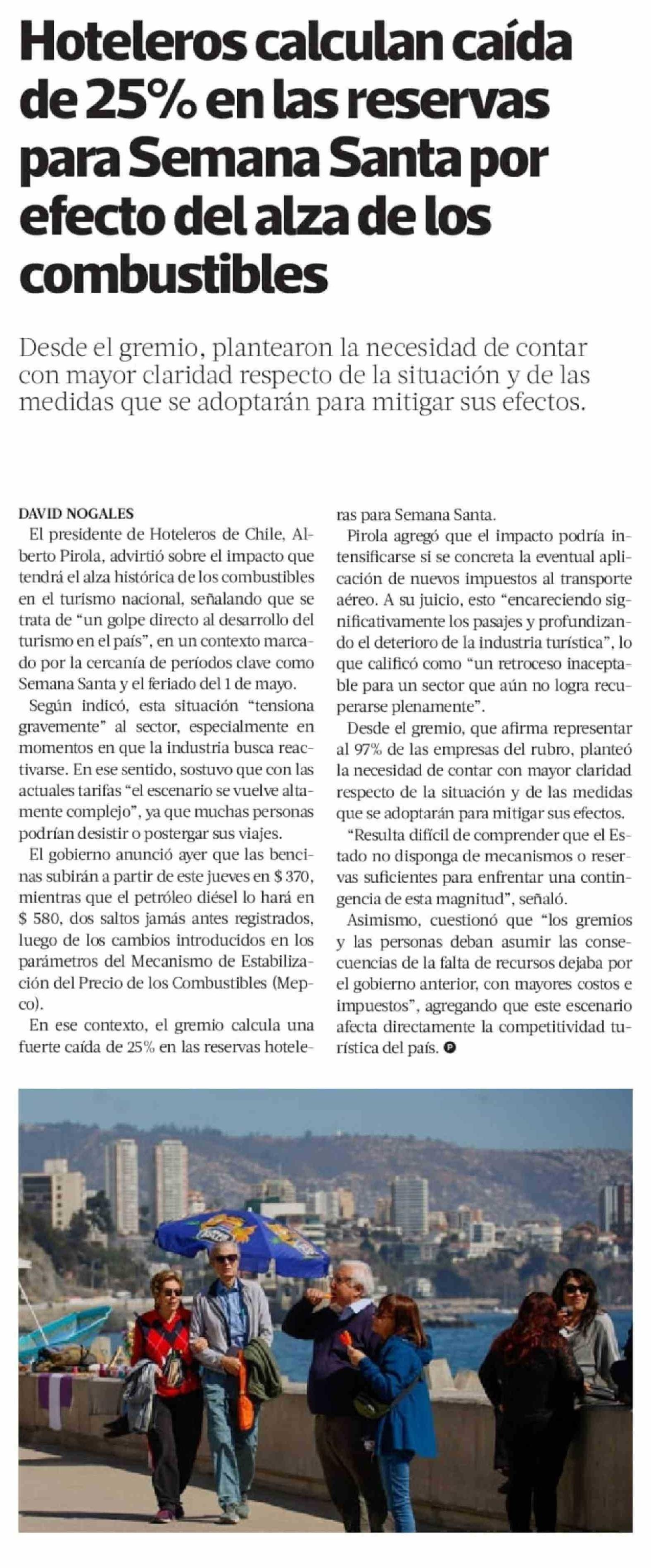 Título: Hoteleros calculan caída de 25% en las reservas para Semana Santa por efecto del alza de los combustibles