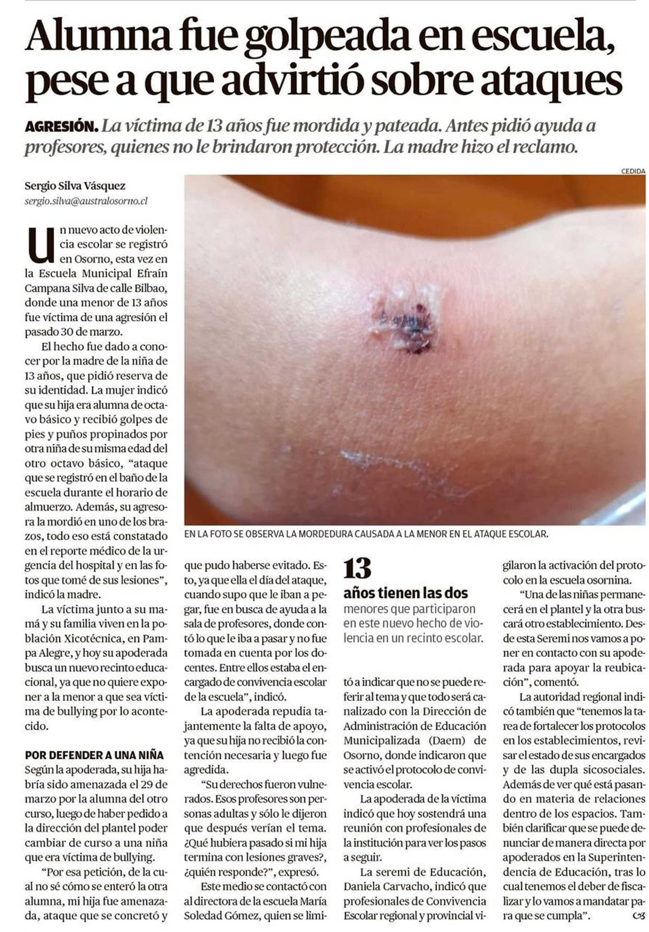 Alumna fue golpeada en escuela, pese a que advirtió sobre ataques 08-04-2022 El Austral de Osorno |
