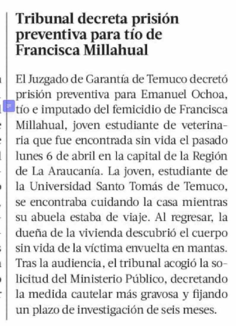 | Título: | Tribunal decreta prisión preventiva para tío de Francisca Millahual |