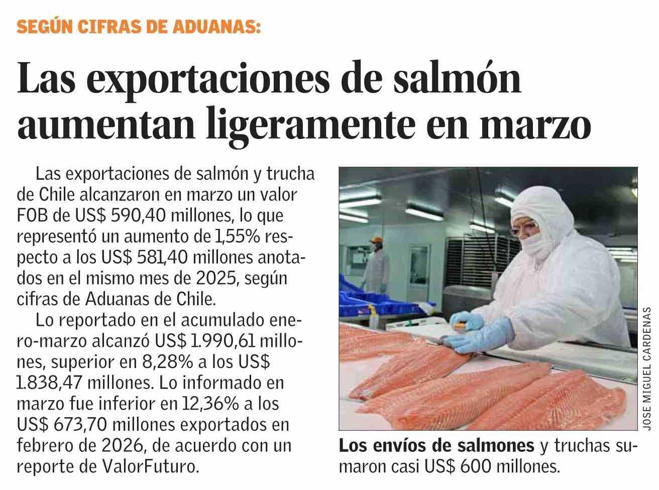 Las exportaciones de salmón aumentan ligeramente en marzo 10-04-2026 El Mercurio |