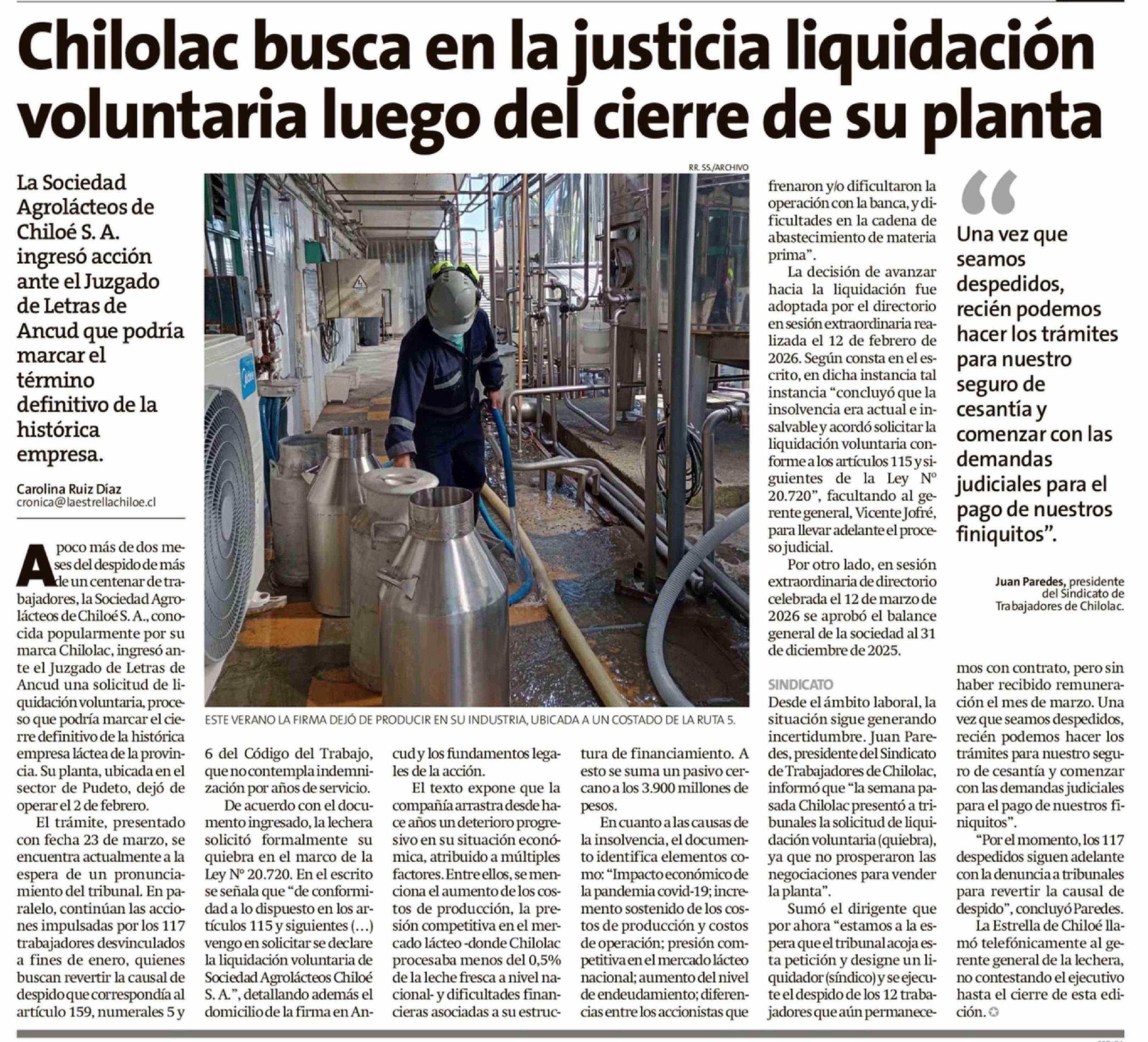 Chilolac busca en la justicia liquidación voluntaria luego del cierre de su planta 04-04-2026 La Estrella de Chiloé |