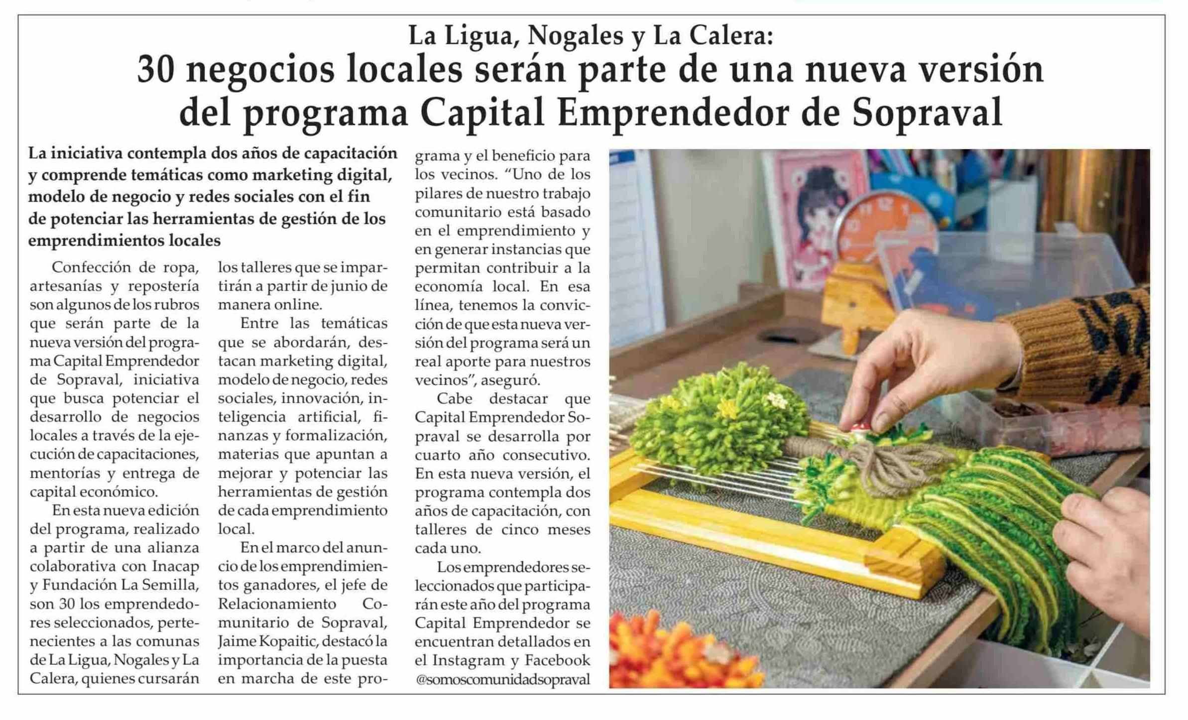 | Título: | 30 negocios locales serán parte de una nueva versión del programa Capital Emprendedor de Sopraval |