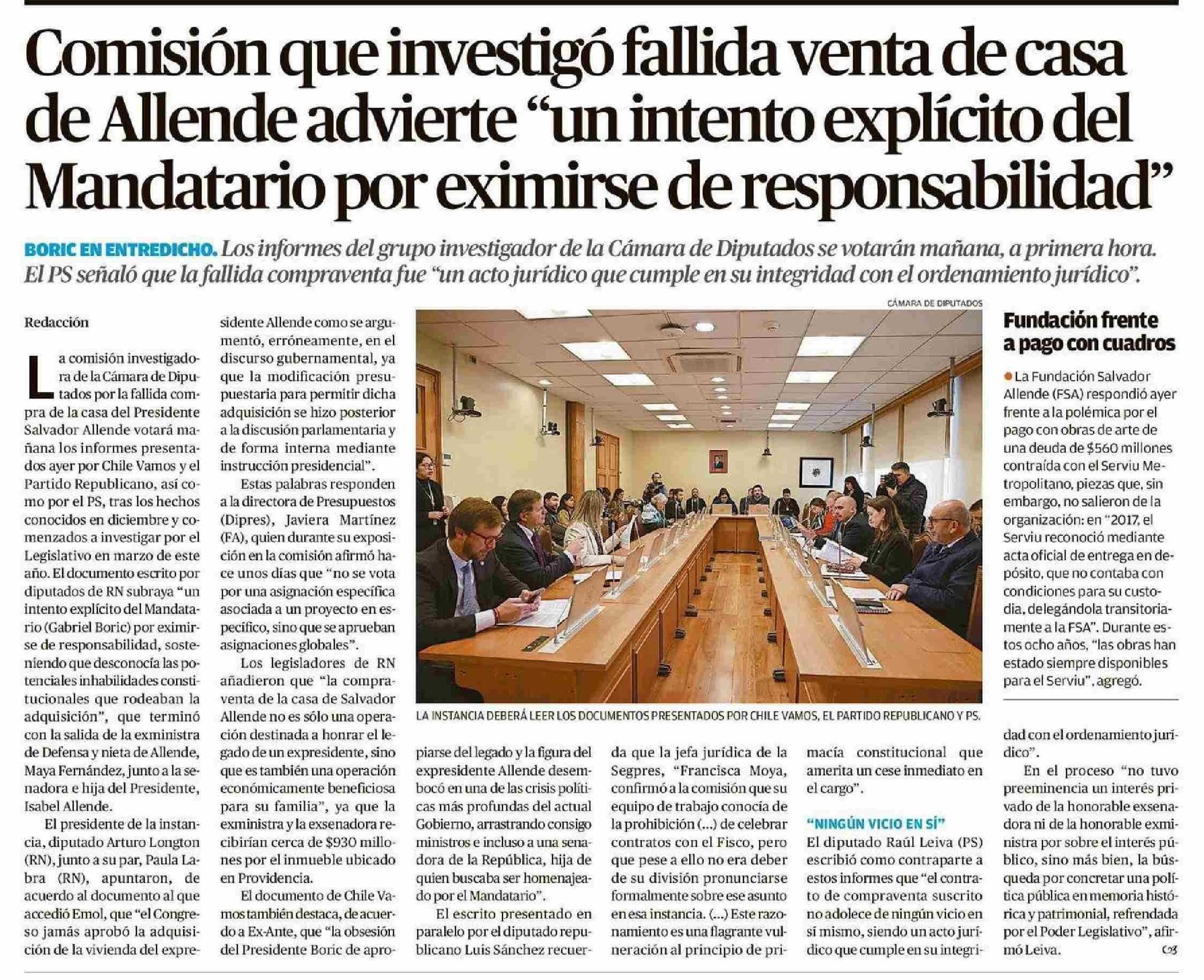 Comisión que investigó fallida venta de casa Mandatario por eximirse de responsabilidad" de Allende advierte "un intento explícito del 17-06-2025 El Mercurio de Valparaíso |