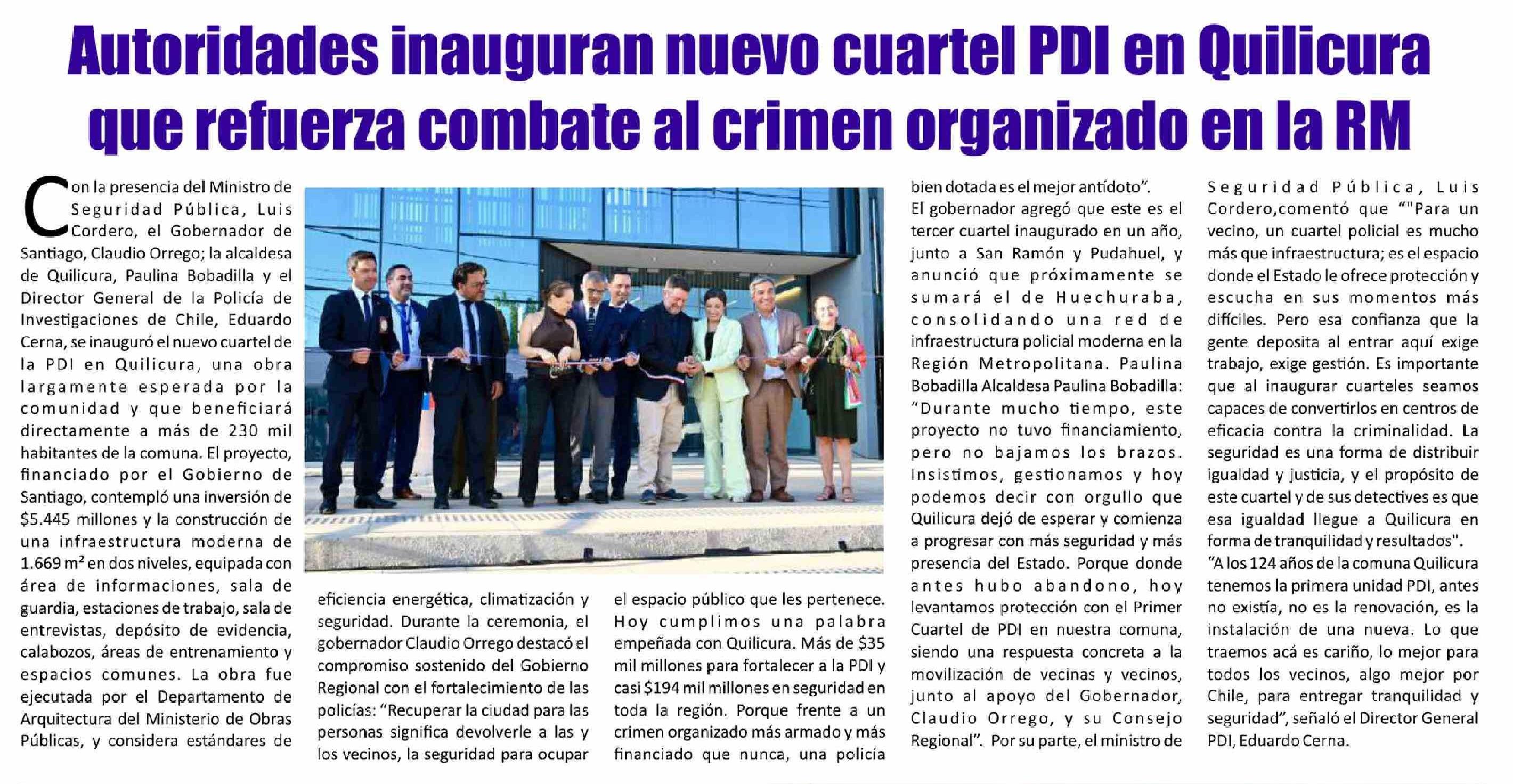 | Título: | Autoridades inauguran nuevo cuartel PDI en Quilicura que refuerza combate al crimen organizado en la RM |