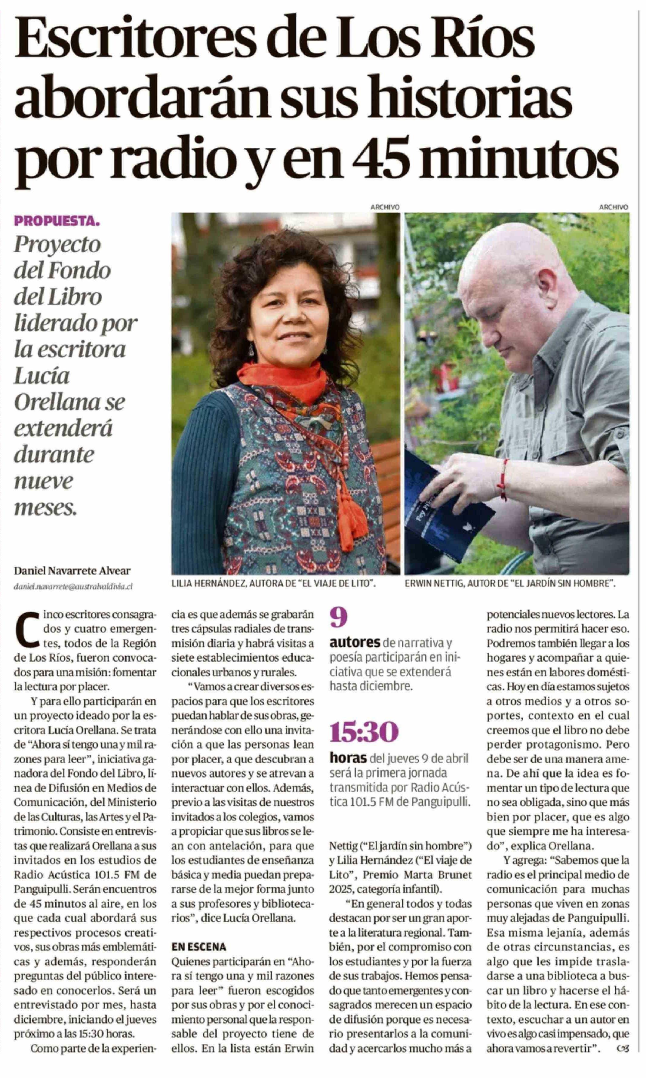Escritores de Los Ríos abordarán sus historias por radio y en 45 minutos 05-04-2026 Diario Austral Región de Los Ríos |