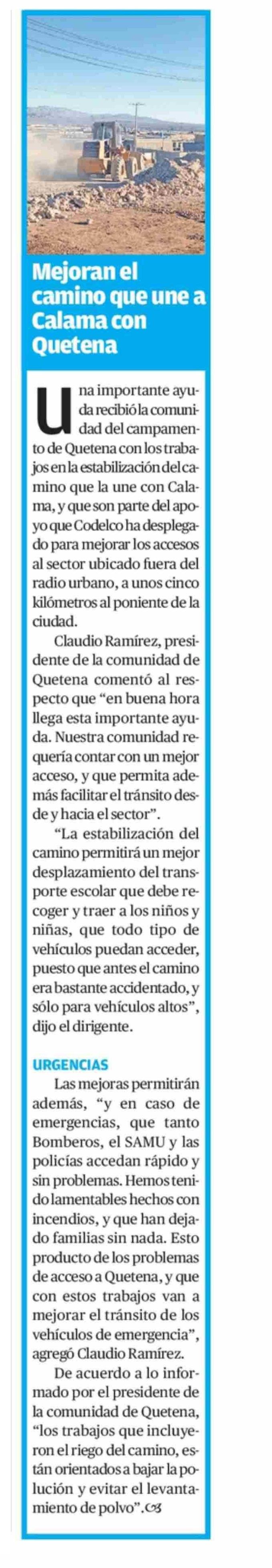 Mejoran el camino que une a Calama con Quetena 27-04-2026 El Mercurio de Antofagasta |