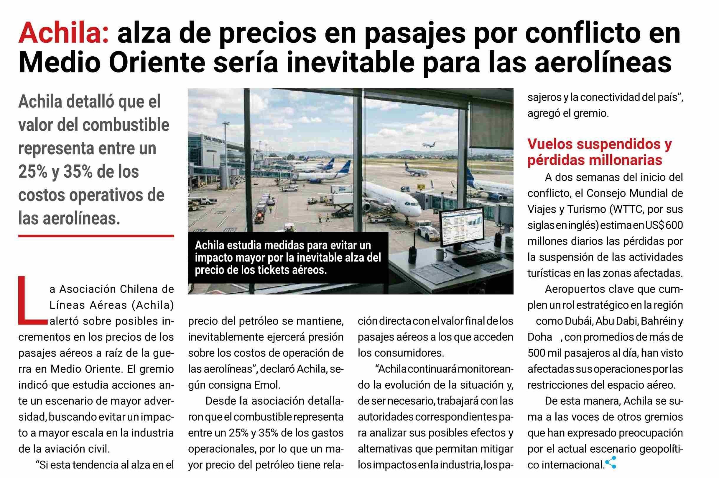 | Título: | Achila: alza de precios en pasajes por conflicto en Medio Oriente sería inevitable para las aerolíneas |