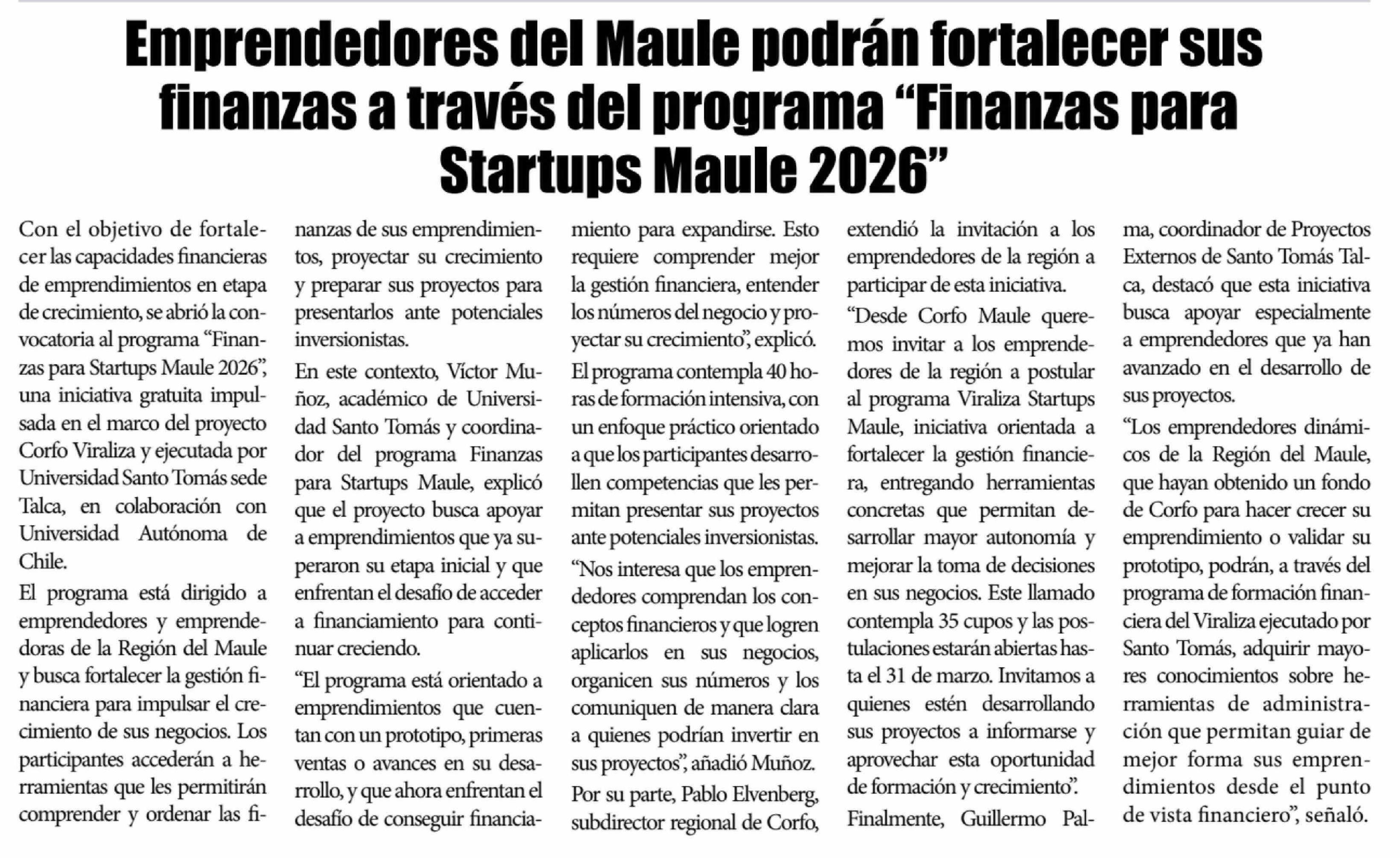 | Título: | Emprendedores del Maule podrán fortalecer sus finanzas a través del programa "Finanzas para Startups Maule 2026" |