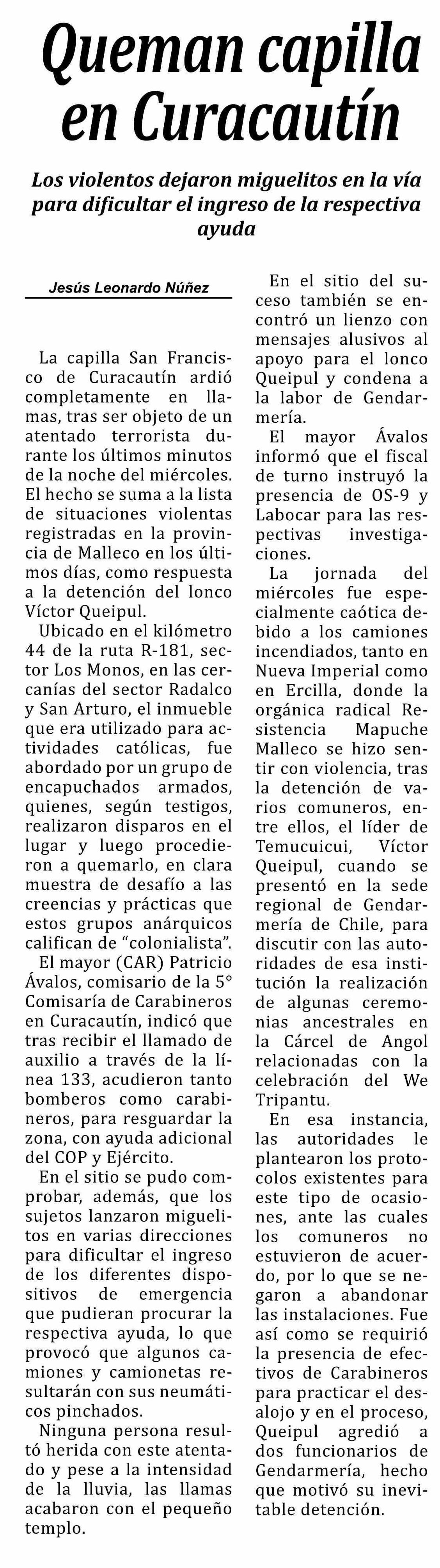 Queman capilla en Curacautín 14-06-2025 Las Noticias |