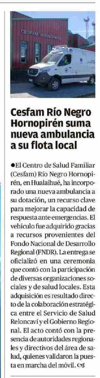 | Título: | Cesfam Rio Negro Hornopiren suma nueva ambulancia a su flota local |