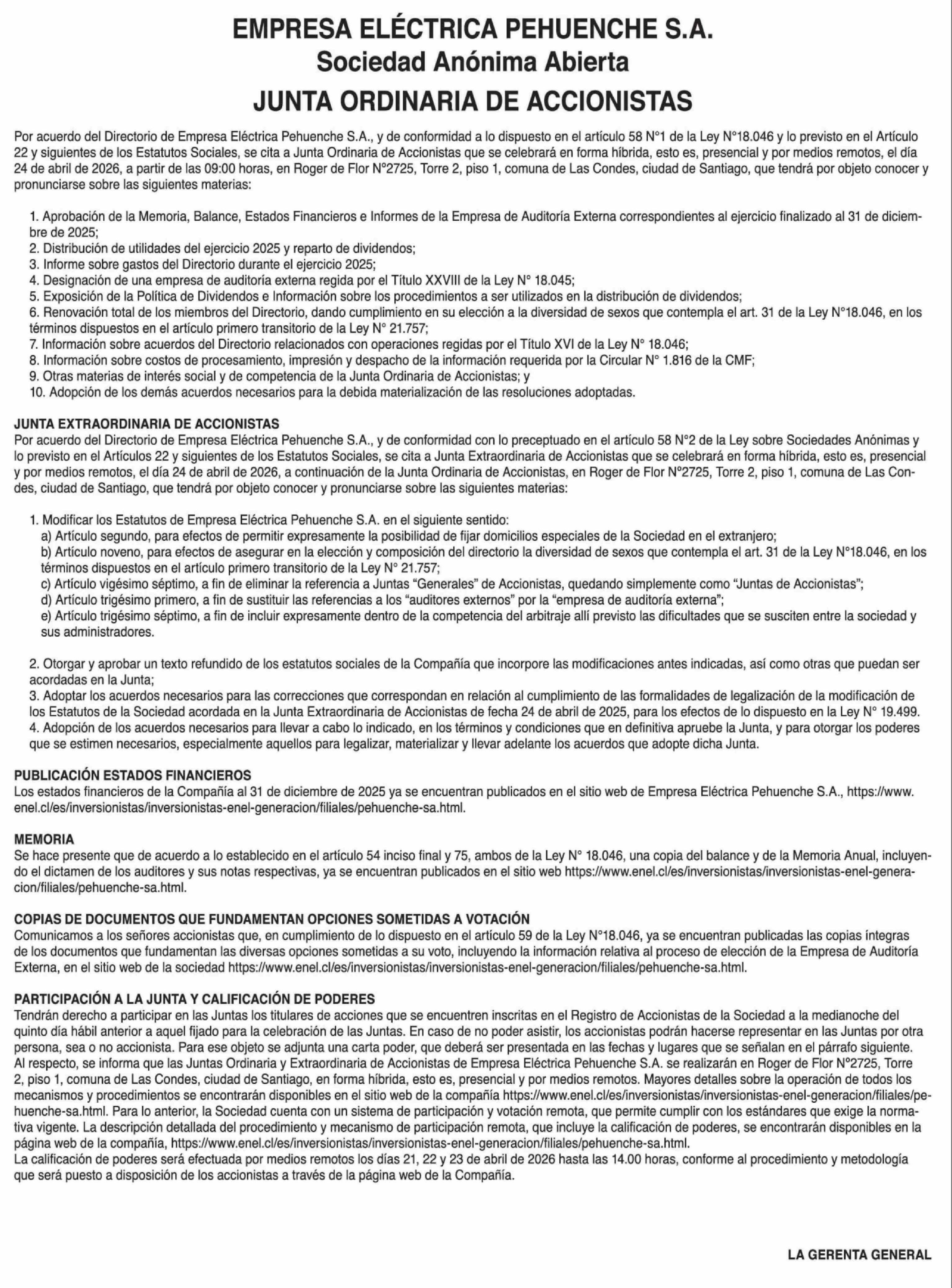 Extractos: EMPRESA ELÉCTRICA PEHUENCHE S.A. 19-04-2026 La Tercera |