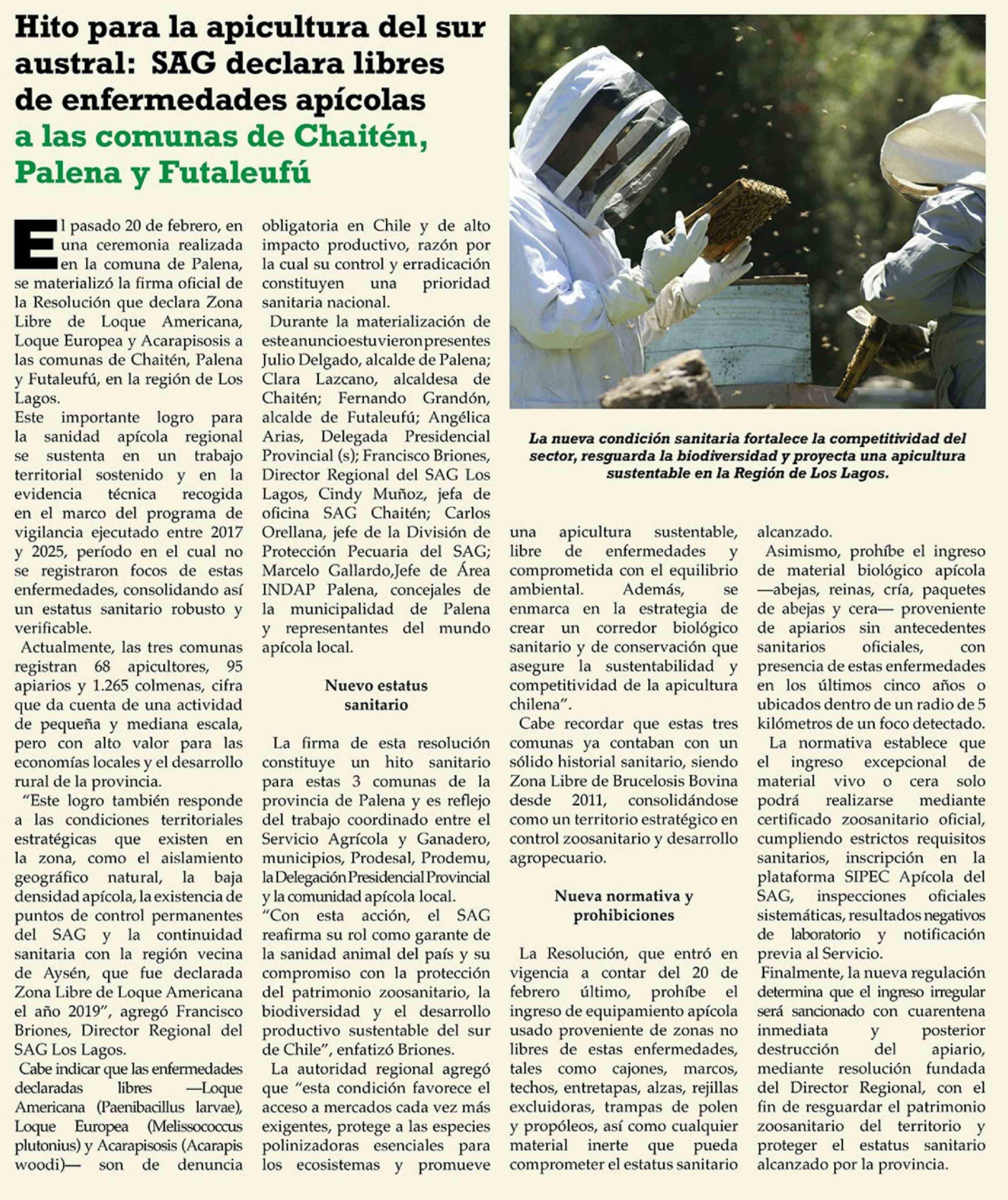 Título: Hito para la apicultura del sur austral: SAG declara libres de enfermedades apícolas a las comunas de Chaiten, Palena y Futaleufú