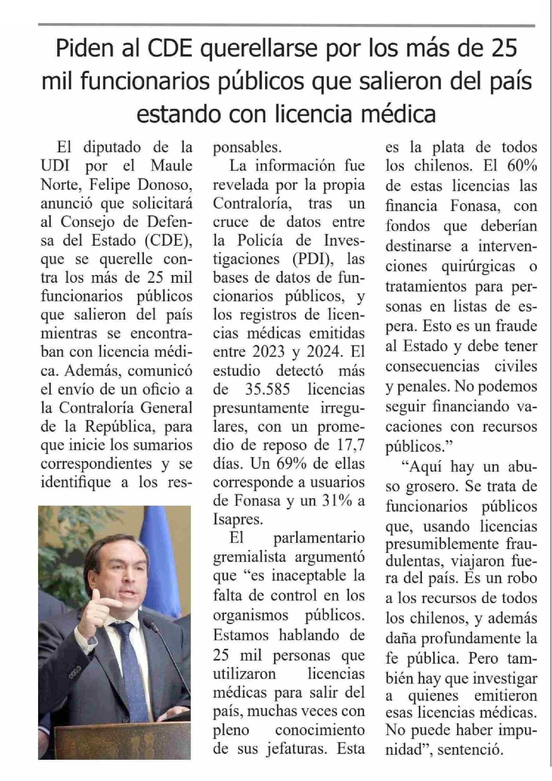 | Título: | Piden al CDE querellarse por los más de 25 mil funcionarios públicos que salieron del país estando con licencia médica |