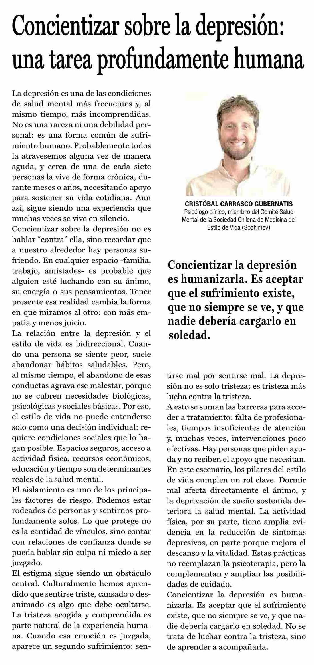 Columnas de Opinión: Concientizar sobre la depresión: una tarea profundamente humana 14-01-2026 La Prensa de Curicó |