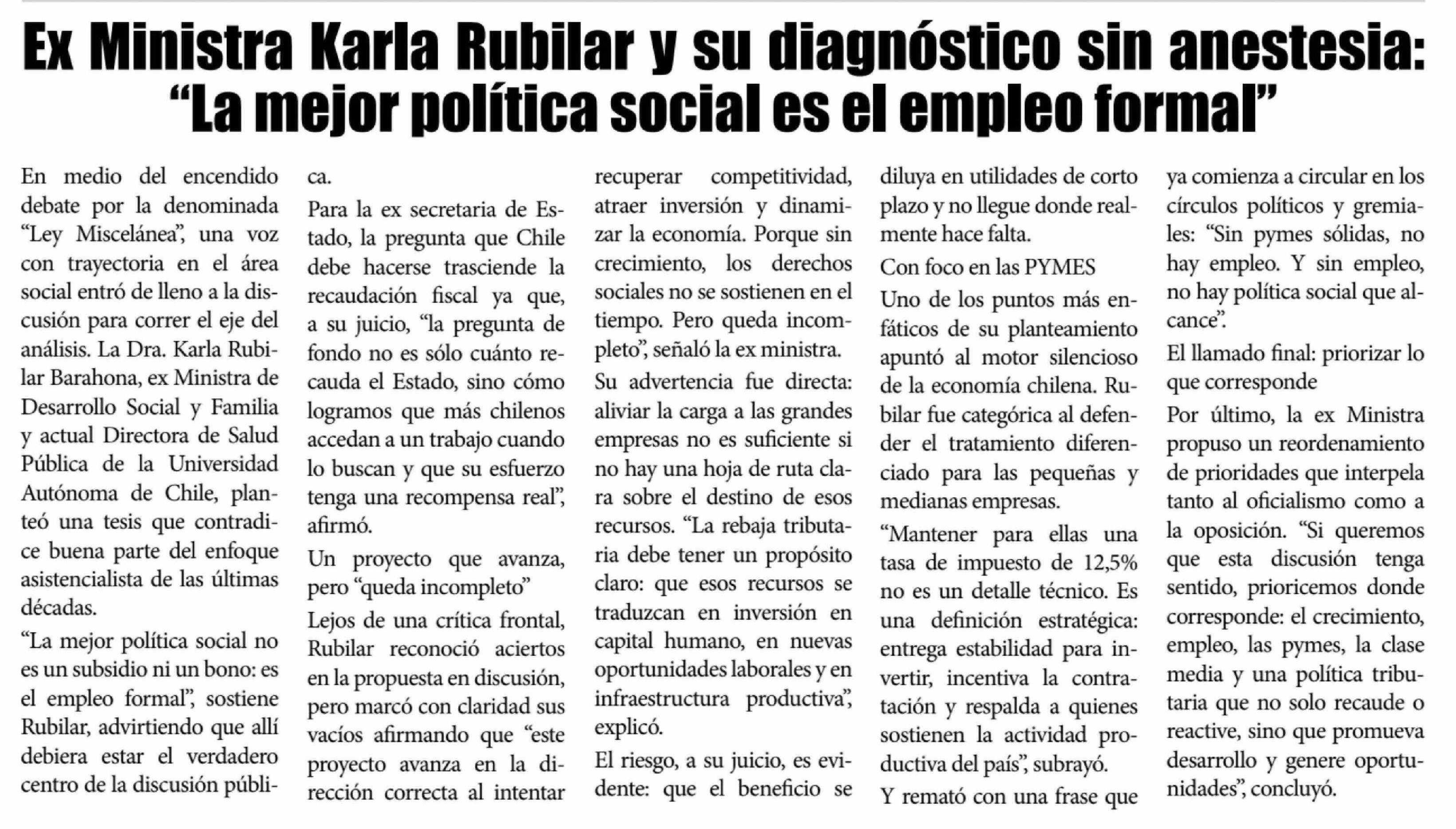 | Título: | Ex Ministra Karla Rubilar y su diagnóstico sin anestesia: "La mejor política social es el empleo formal" |