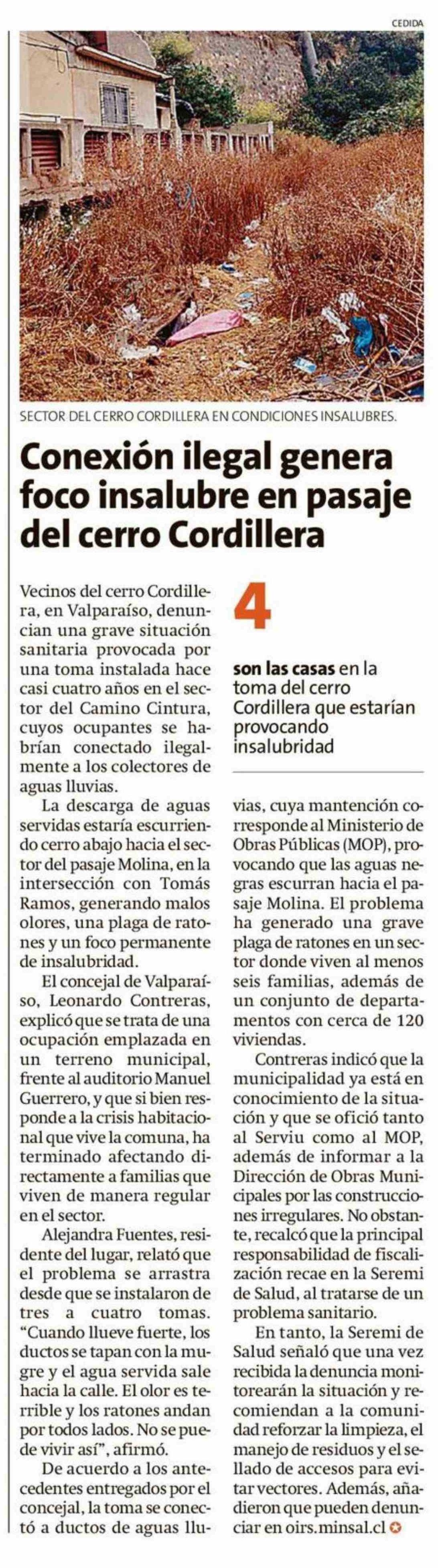 | Título: | Conexión ilegal genera foco insalubre en pasaje del cerro Cordillera |