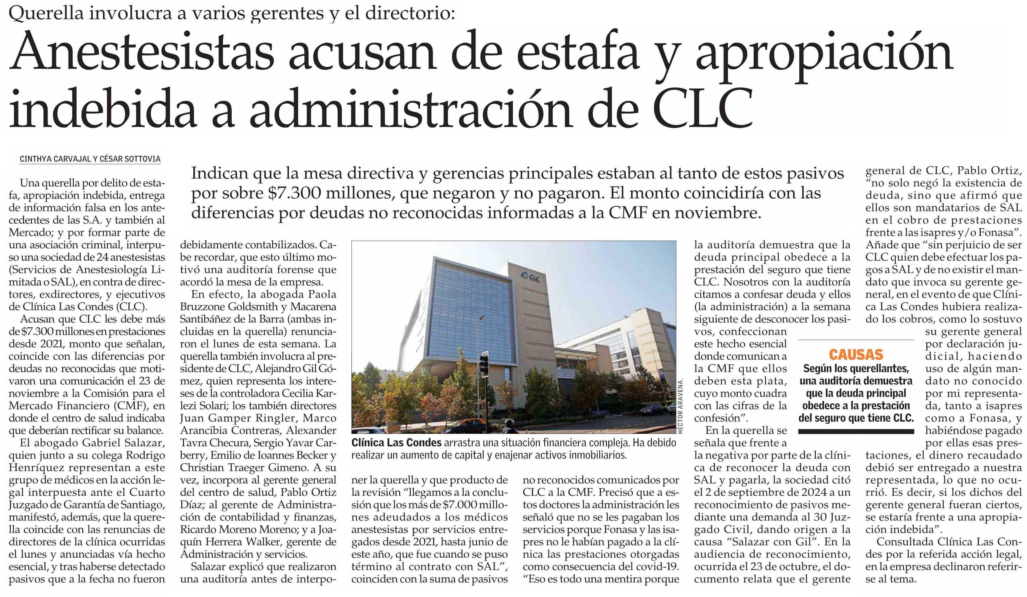 Anestesistas acusan de estafa y apropiación indebida a administración de CLC 18-12-2024 El Mercurio |