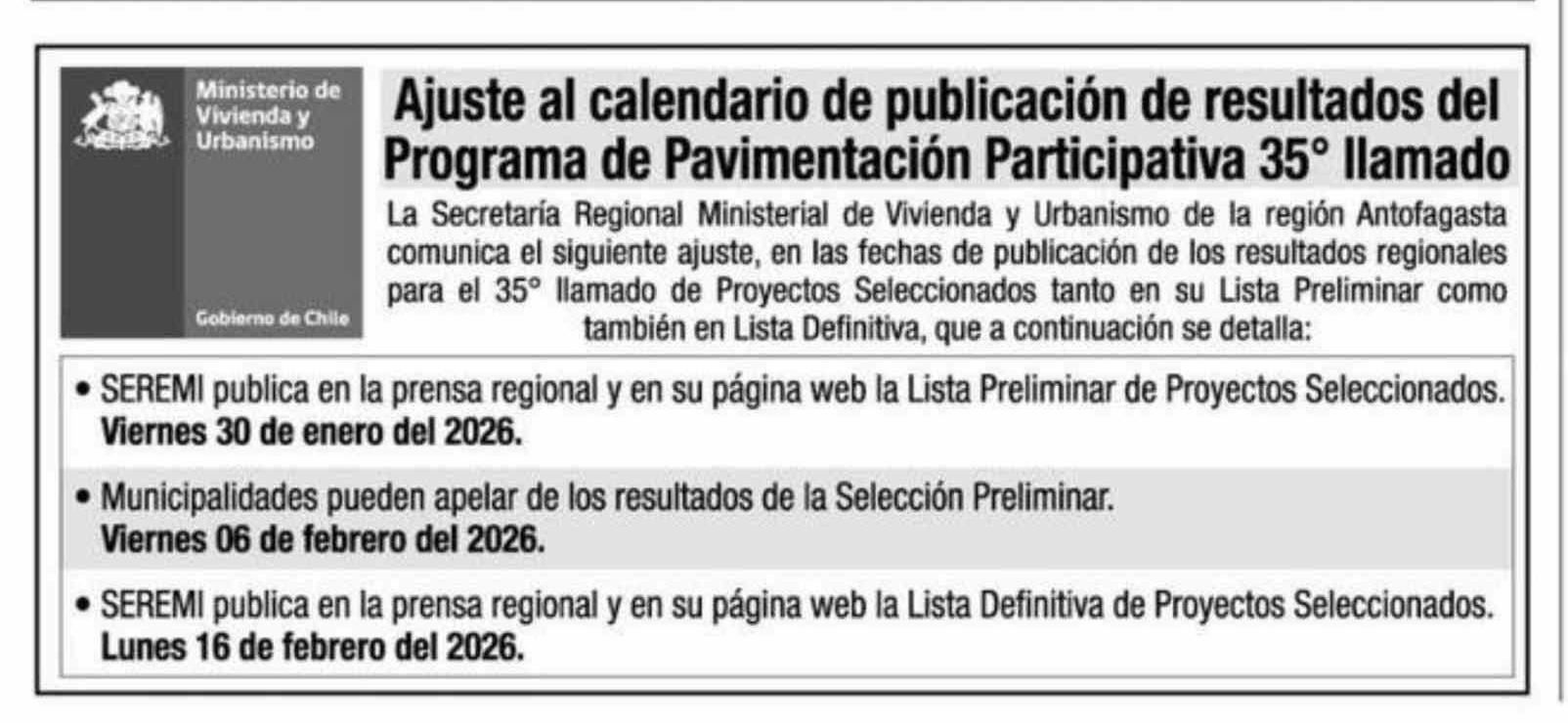 Aviso Publicitario: Ajuste al calendario de publicación de resultados del Programa de Pavimentación Participativa 35° llamado 16-01-2026 La Estrella de Antofagasta |
