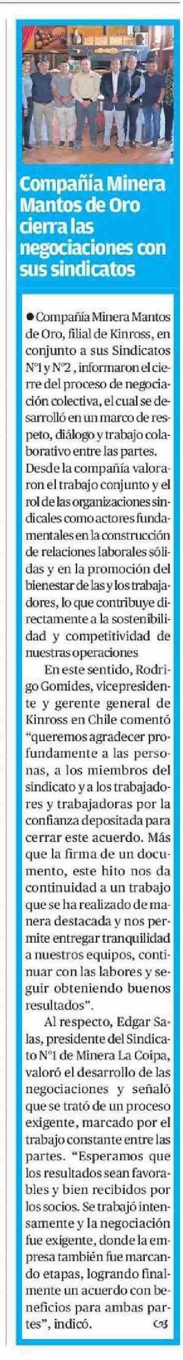 Compañía Minera Mantos de Oro cierra las negociaciones con sus sindicatos 11-01-2026 El Diario de Atacama |