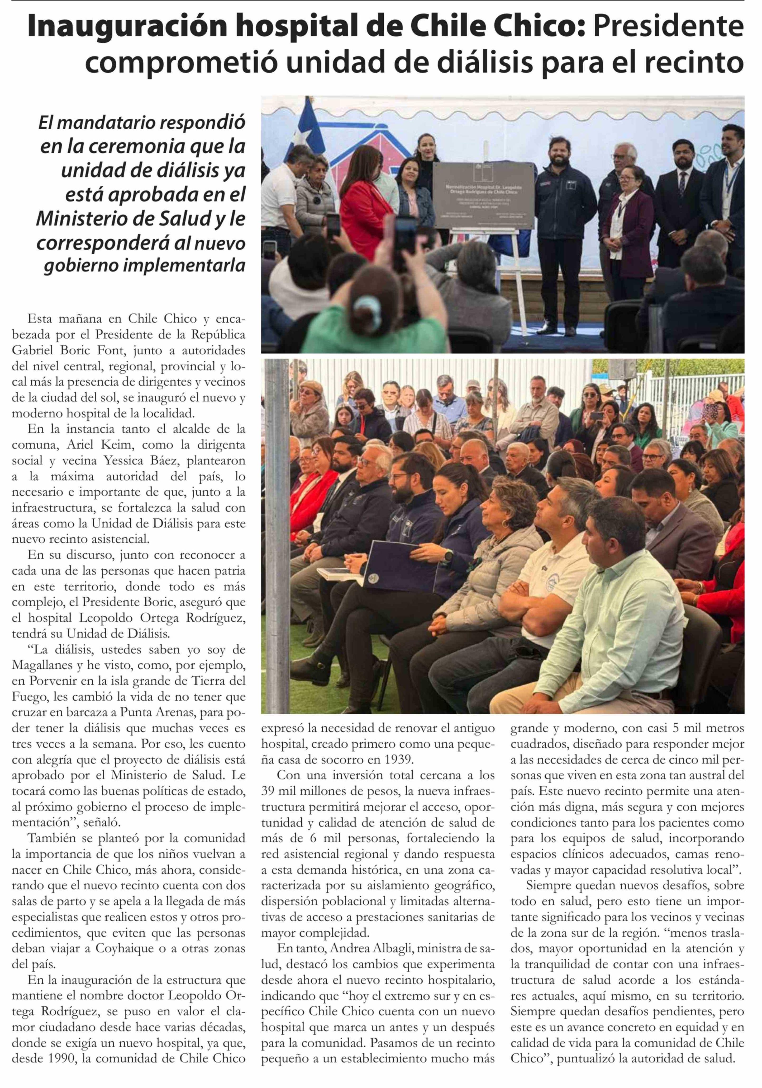 Inauguración hospital de Chile Chico: Presidente comprometió unidad de diálisis para el recinto 05-02-2026 El Divisadero |