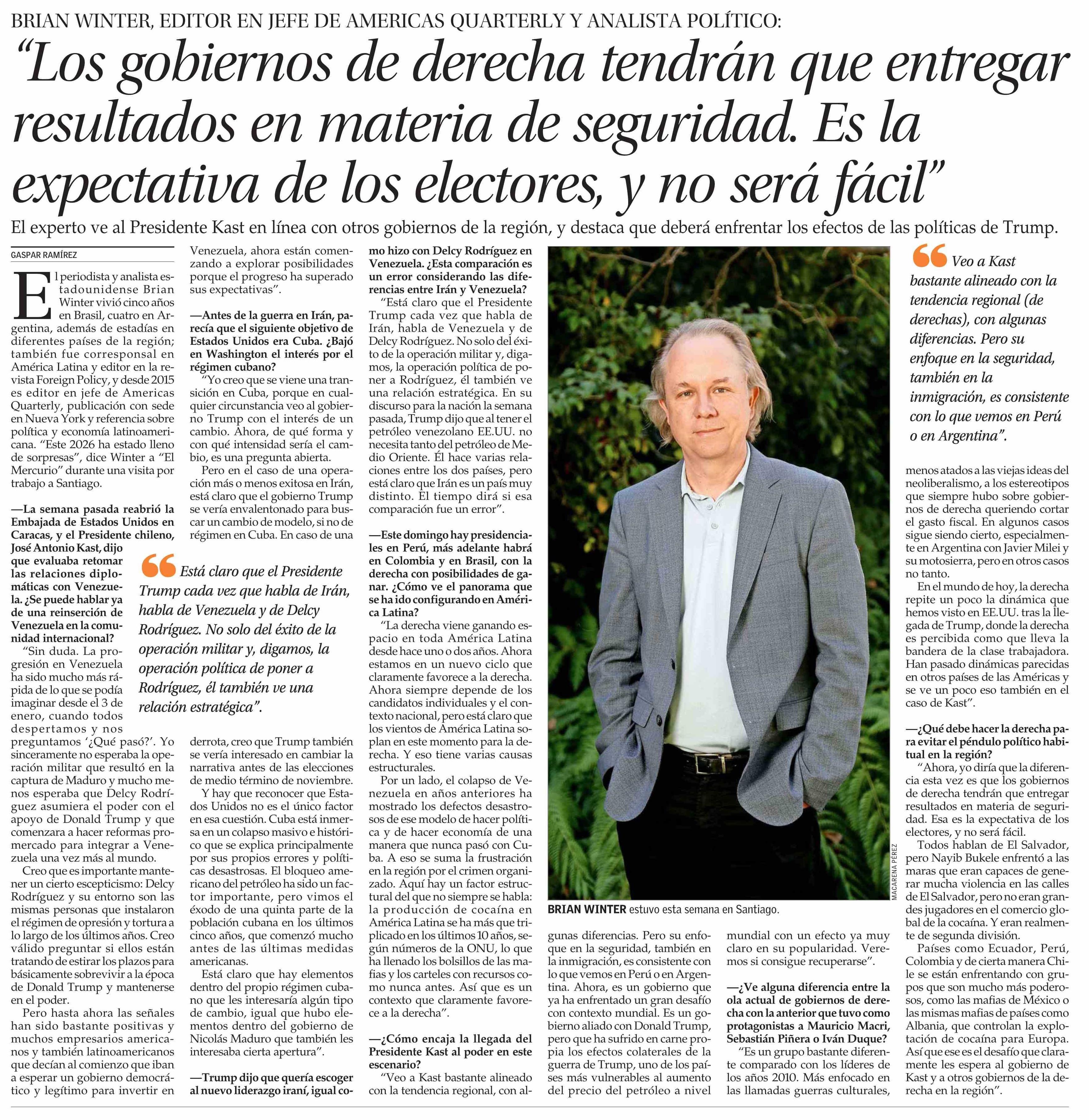 “Los gobiernos de derecha tendrán que entregar resultados en materia de seguridad. Es la expectativa de los electores, y no será fácil” 09-04-2026 El Mercurio |