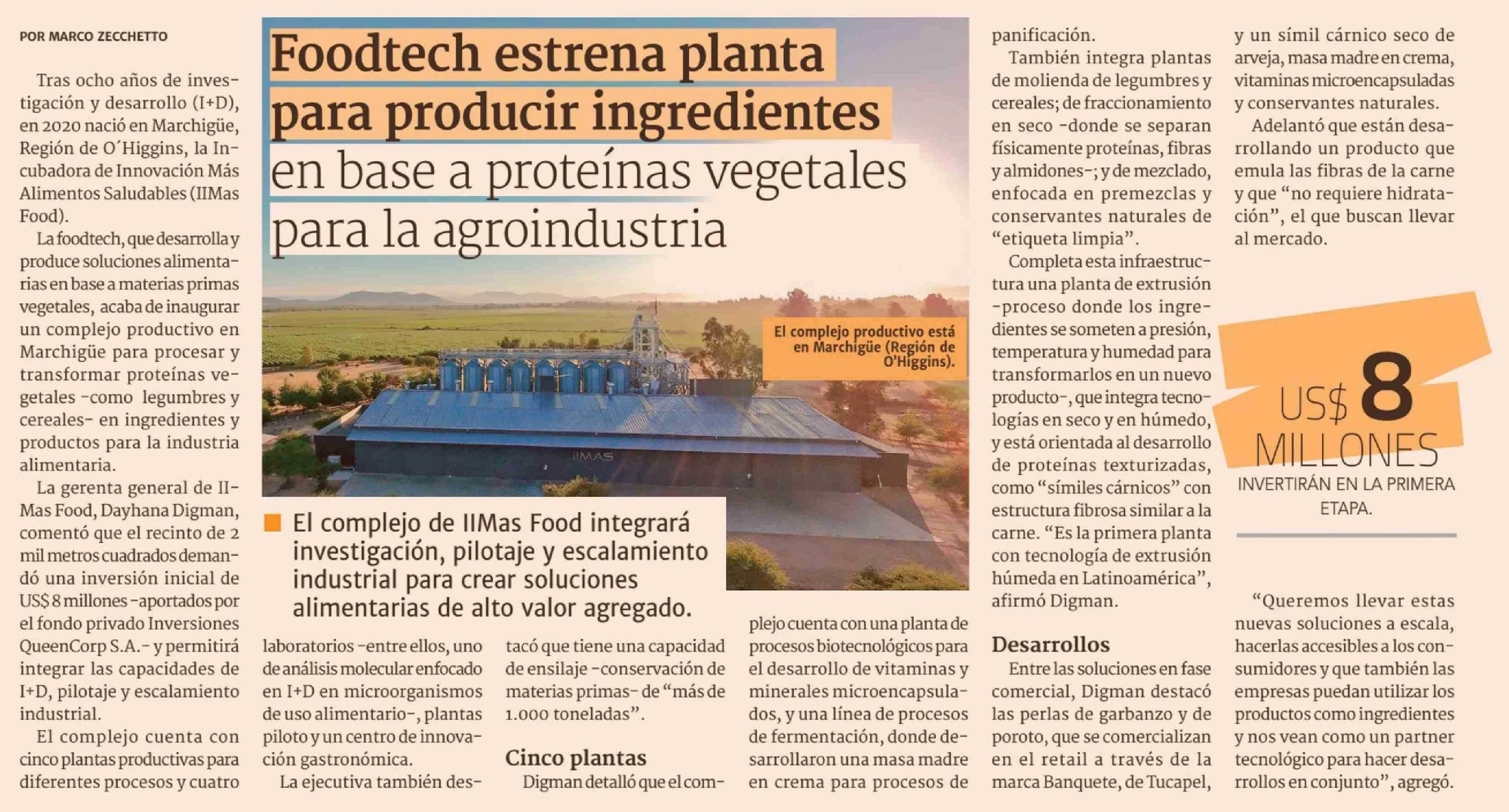 | Título: | Foodtech estrena planta para producir ingredientes en base a proteínas vegetales para la agroindustria |