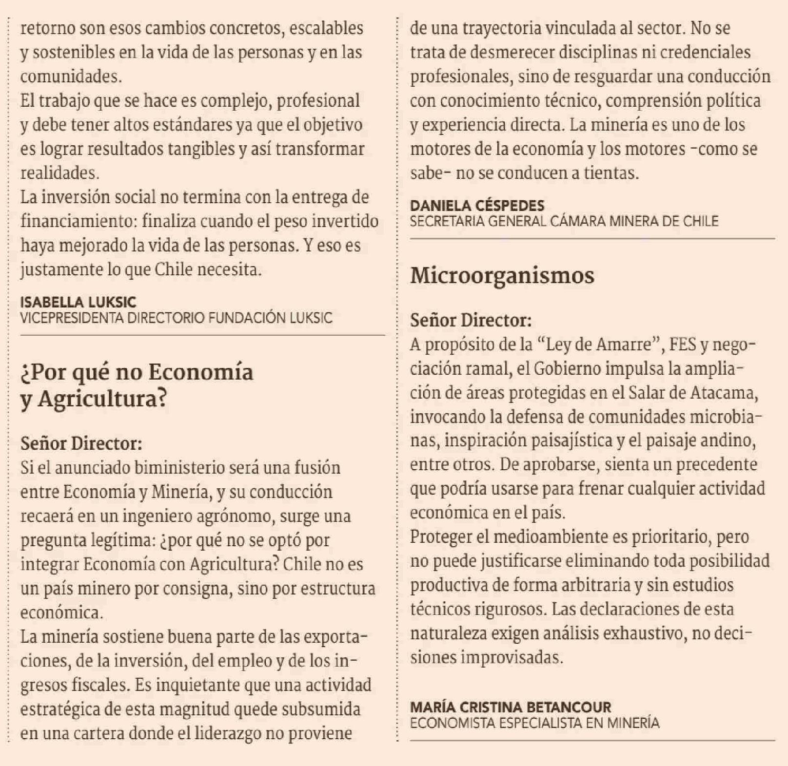 Cartas: ¿Por qué no Economía y Agricultura? 22-01-2026 Diario Financiero |