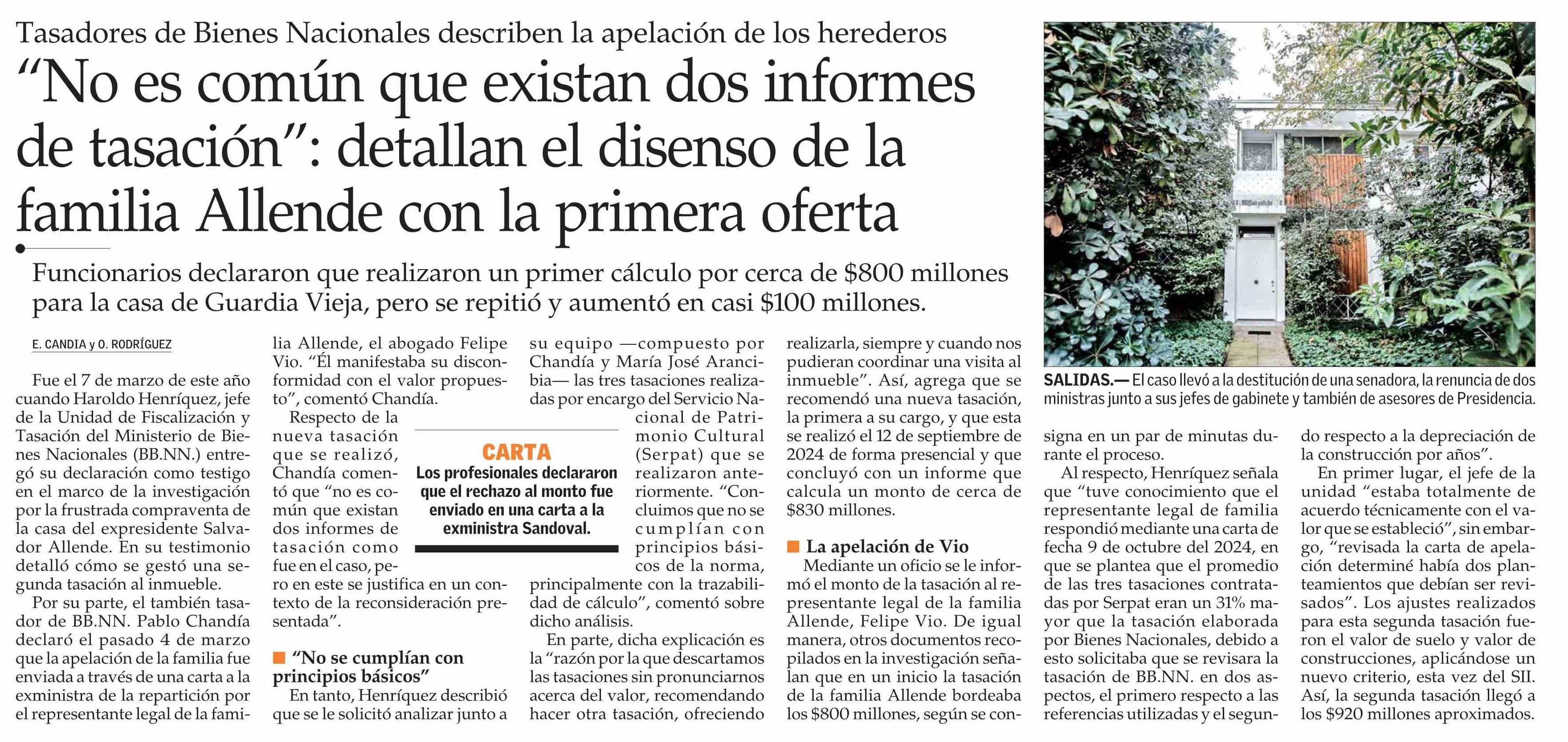 “No es común que existan dos informes de tasación”: detallan el disenso de la familia Allende con la primera oferta 05-06-2025 El Mercurio |