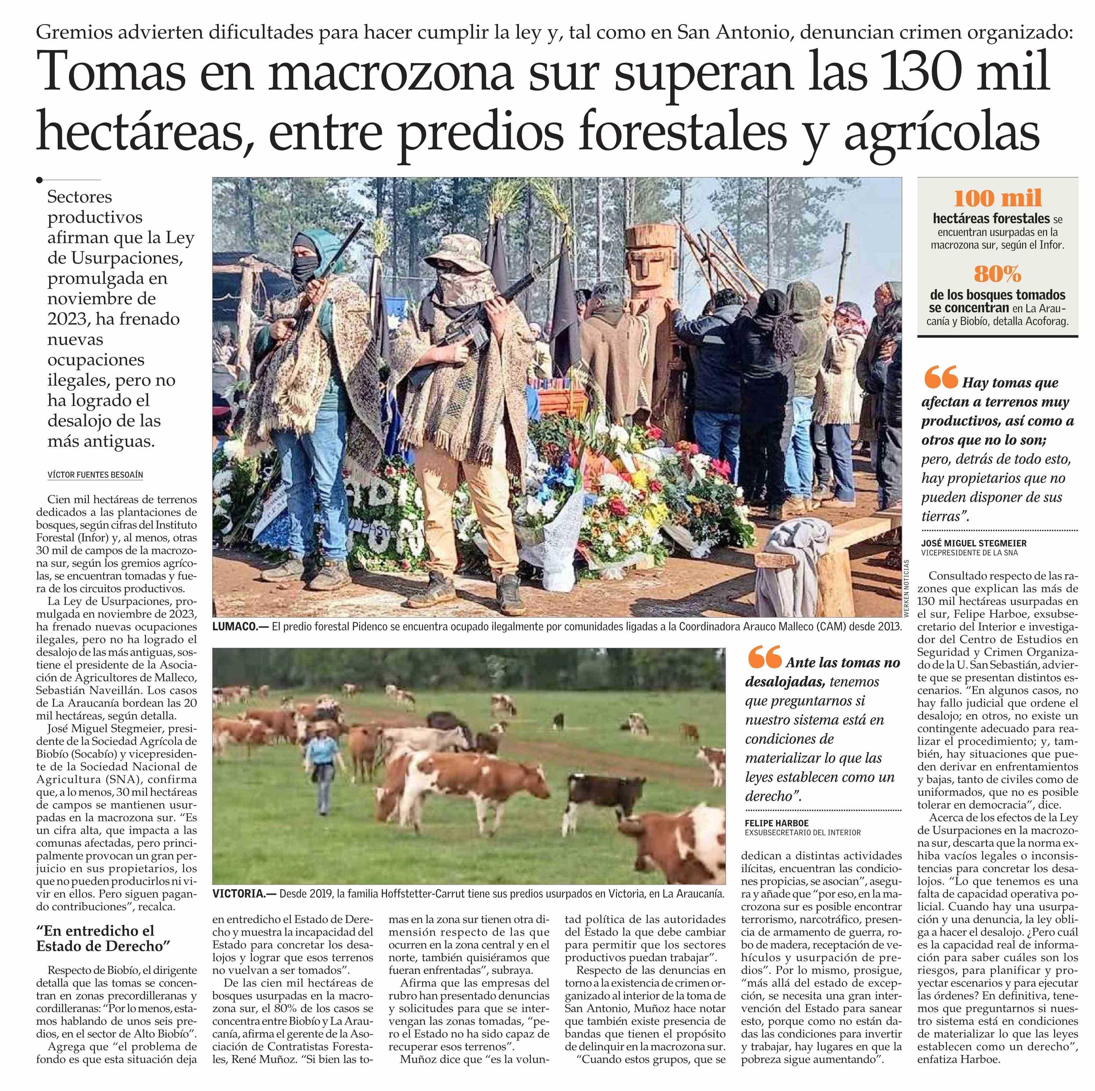 Tomas en macrozona sur superan las 130 mil. hectáreas, entre predios forestales y agrícolas 18-01-2026 El Mercurio |