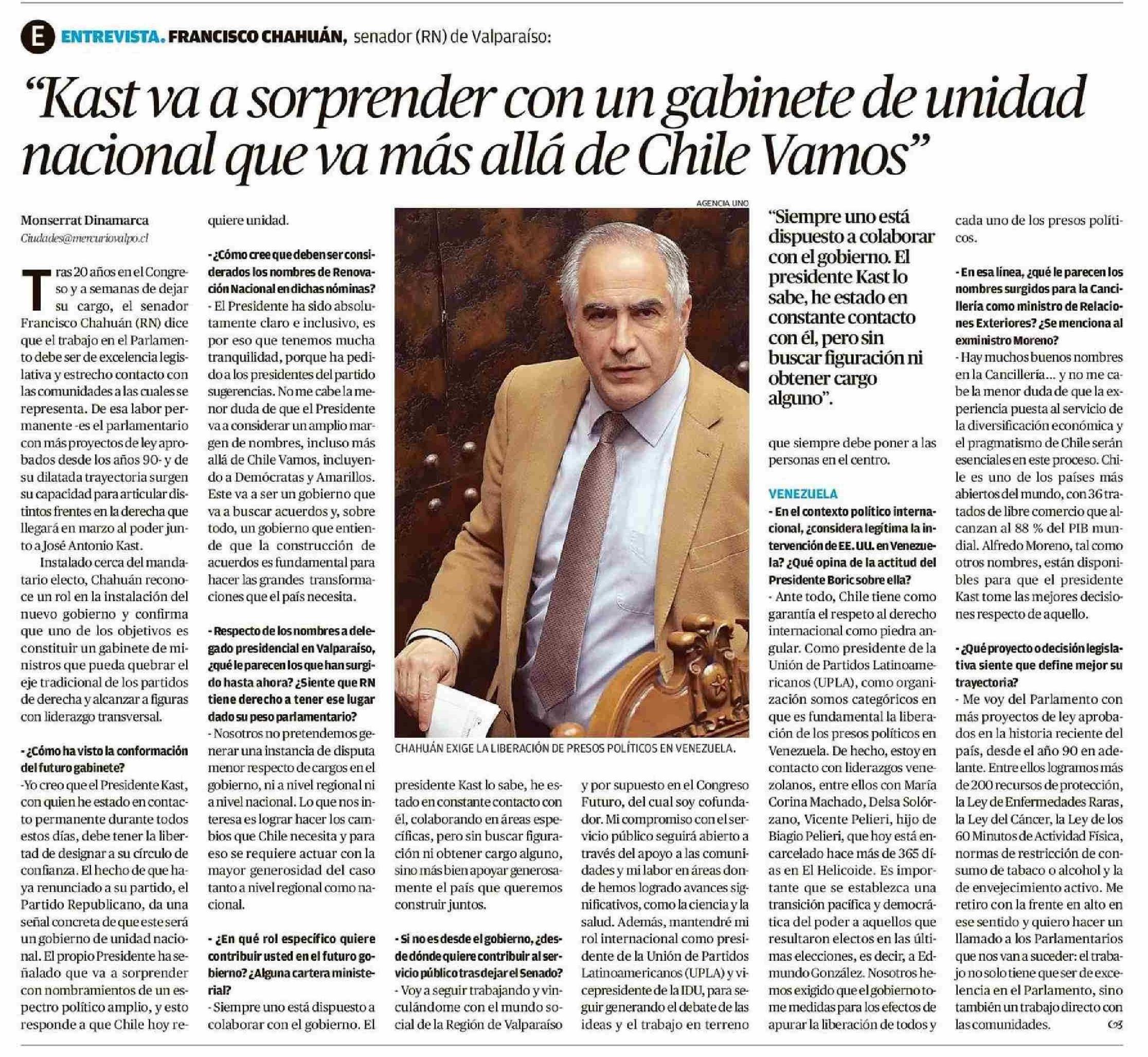 Título: "Kast va a sorprender con un gabinete de unidad nacional que va más allá de Chile Vamos"