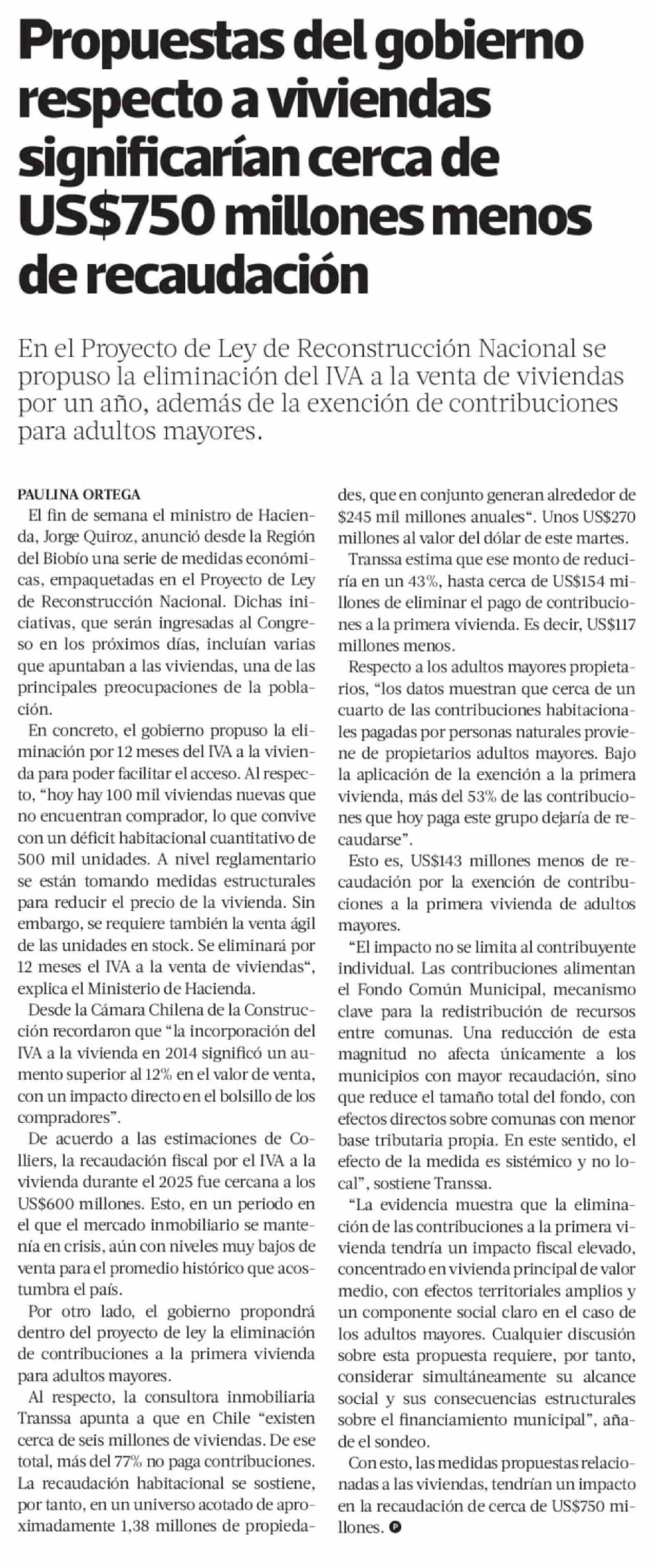 Propuestas del gobierno respecto a viviendas significarían cerca de US$750 millones menos de recaudación 18-03-2026 La Tercera |