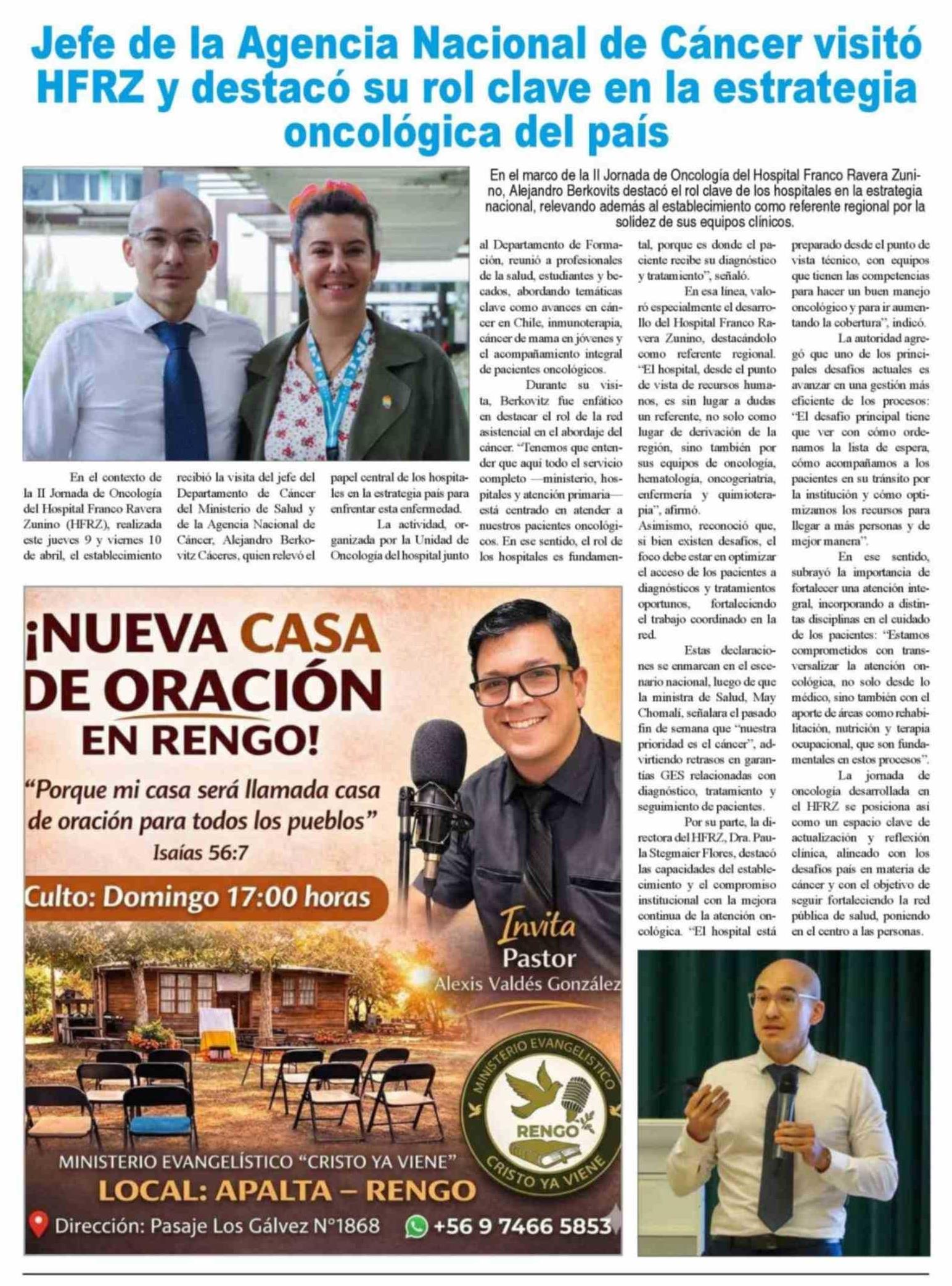 Jefe de la Agencia Nacional de Cáncer visitó HFRZ y destacó su rol clave en la estrategia oncológica del país 24-03-2026 Diario VI Región |