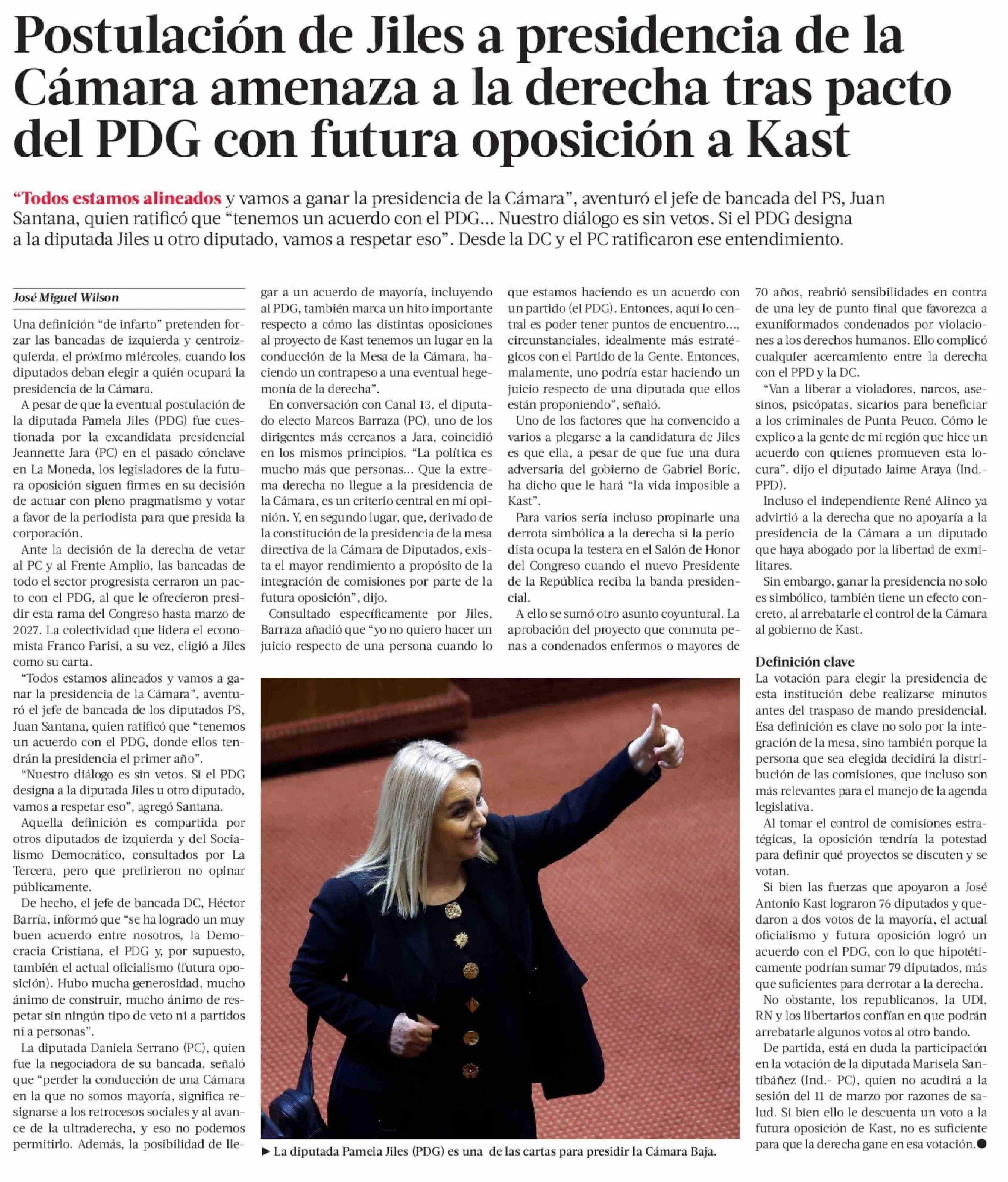 | Título: | Postulación de Jiles a presidencia de la Cámara amenaza a la derecha tras pacto del PDG con futura oposición a Kast |