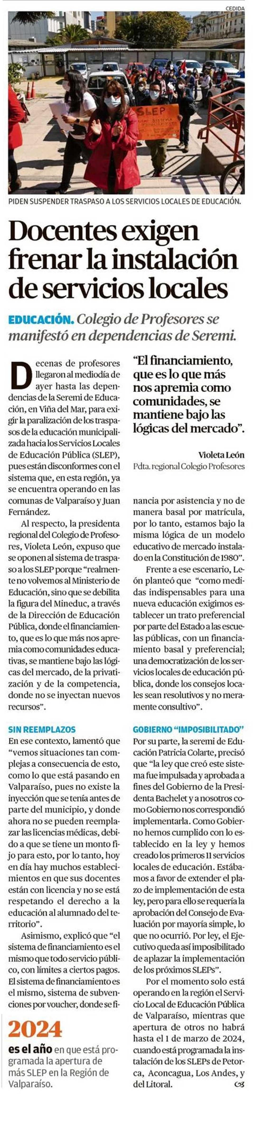 Docentes exigen frenar la instalación de servicios locales 27-08-2021 El Mercurio de Valparaíso |