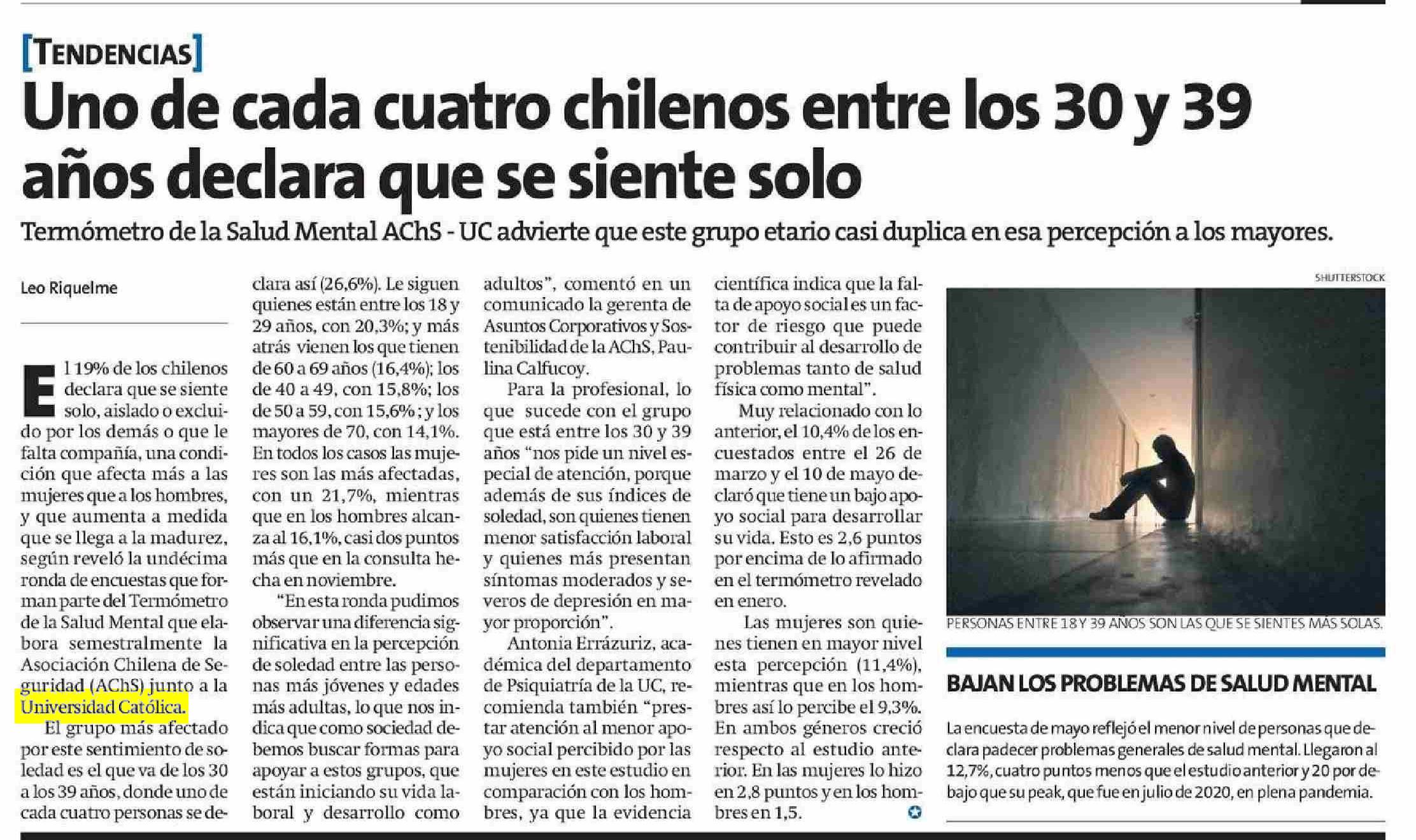 | Título: | Uno de cada cuatro chilenos entre los 30 y 39 años declara que se siente solo |