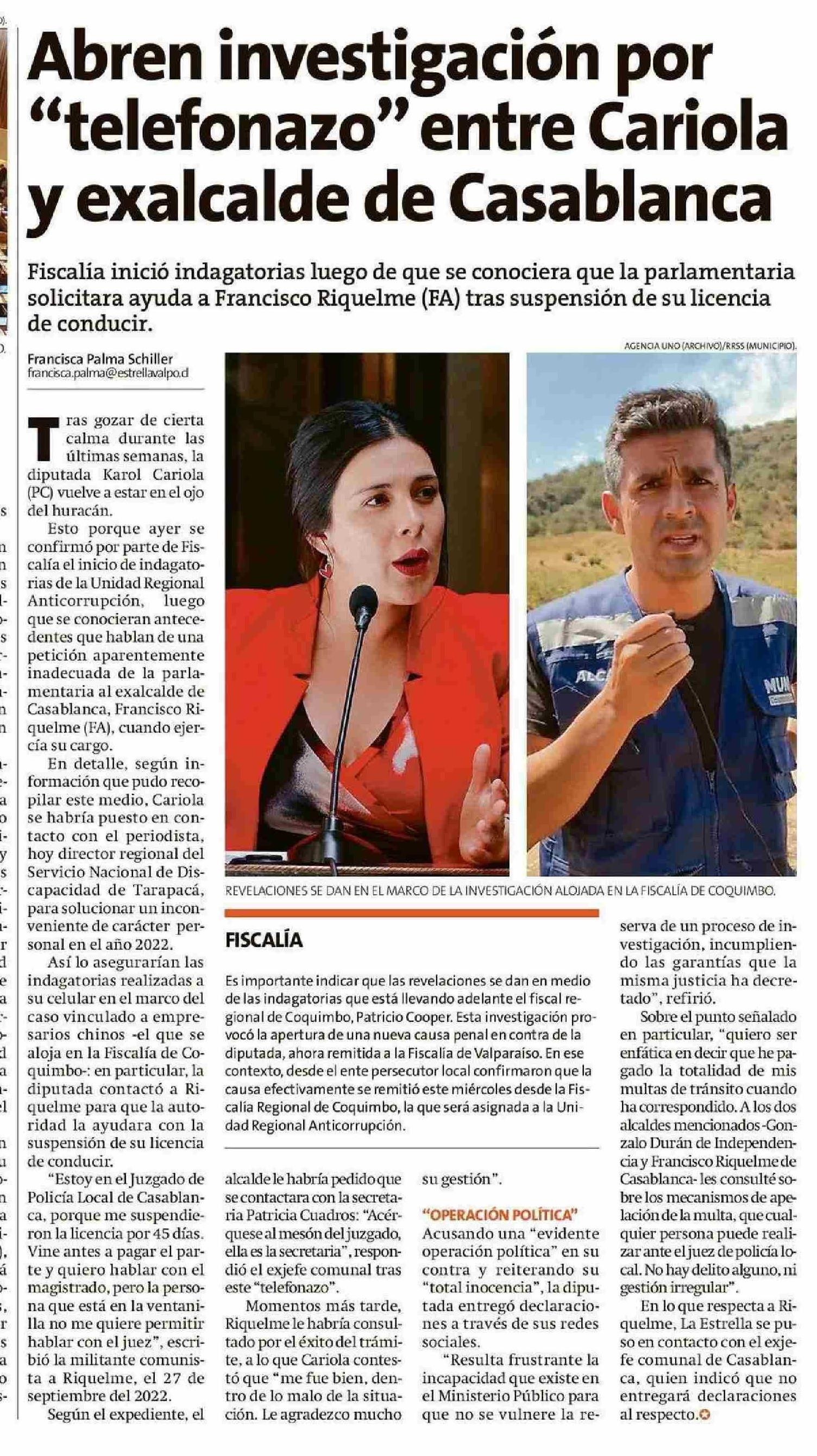 Abren investigación por y exalcalde de Casablanca "telefonazo" entre Cariola 19-06-2025 La Estrella de Valparaíso |